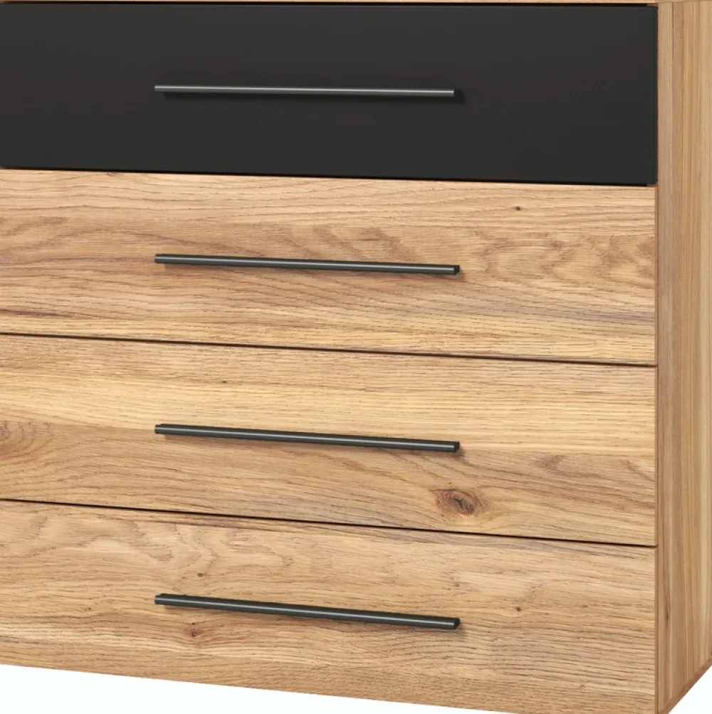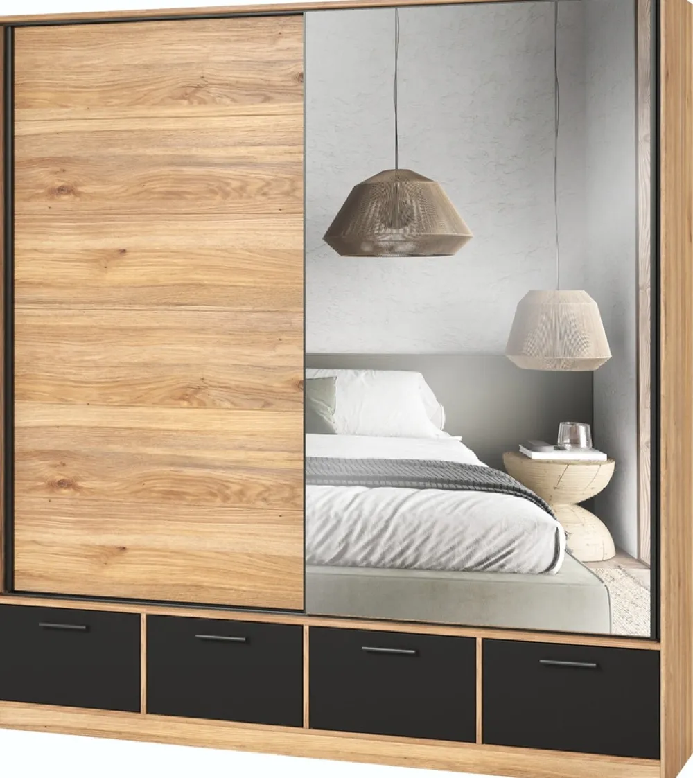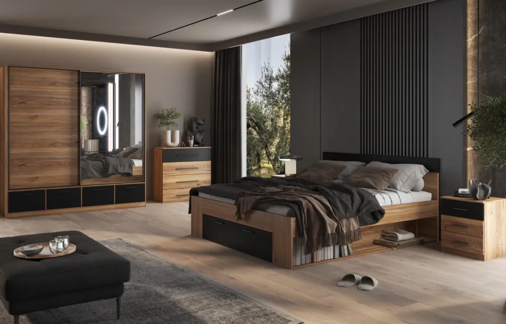 Szafa przesuwna, z czterema pojemnymi szufladami, oferuje niezwykle dużo miejsca na Twoje ubrania, buty i inne akcesoria, pomagając utrzymać porządek w sypialni. Komoda z czterema szufladami to idealne uzupełnienie, w którym z łatwością zmieścisz bieliznę, biżuterię czy inne drobiazgi. Dwa stoliki nocne dodają symetrii i równowagi, a jednocześnie są praktycznym miejscem na lampkę nocną, książkę czy budzik.