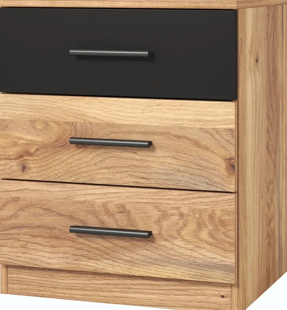 - Zestaw mebli do sypialni w stylu loftowym BETA składa się z łóżka o powierzchni spania 180×200 cm, szafy przesuwnej, komody z czterema szufladami oraz dwóch szafek nocnych. Meble wykonane z płyty laminowanej 16 mm, krawędzie zabezpieczono okleiną ABS