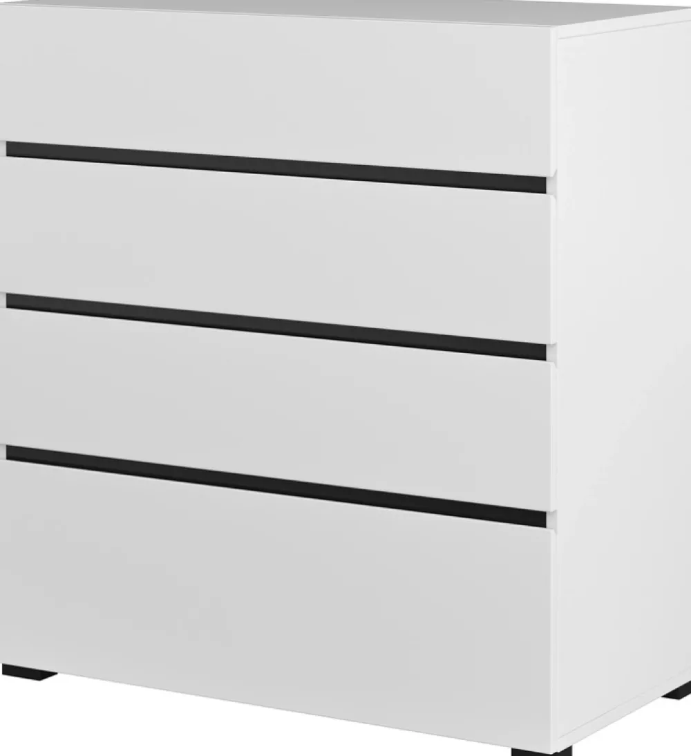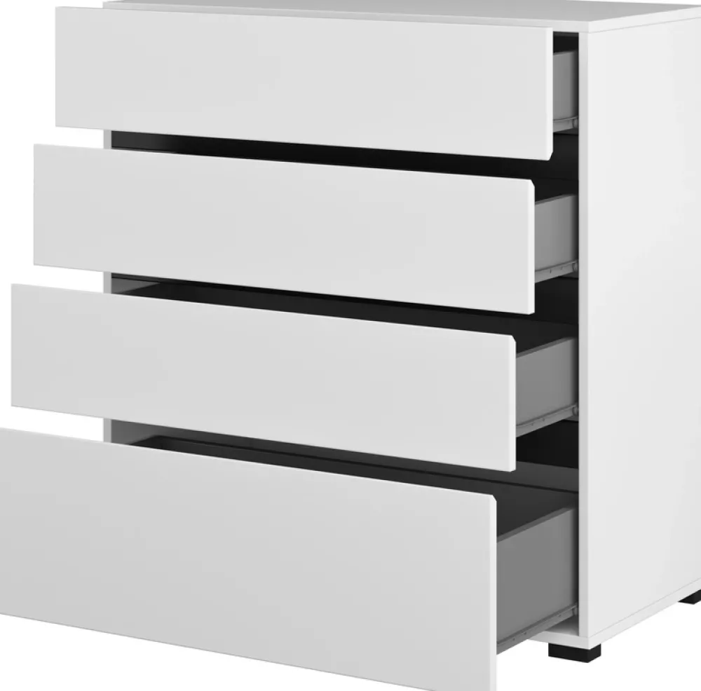 Dzięki czterem praktycznym szufladom z rolkowymi prowadnicami komoda zapewnia łatwy dostęp do przechowywanych rzeczy, niezależnie od ich wagi. Obrzeża wykończone odporną na uszkodzenia okleiną ABS chronią mebel przed codziennym zużyciem, co sprawia, że będzie służyć przez długie lata.
