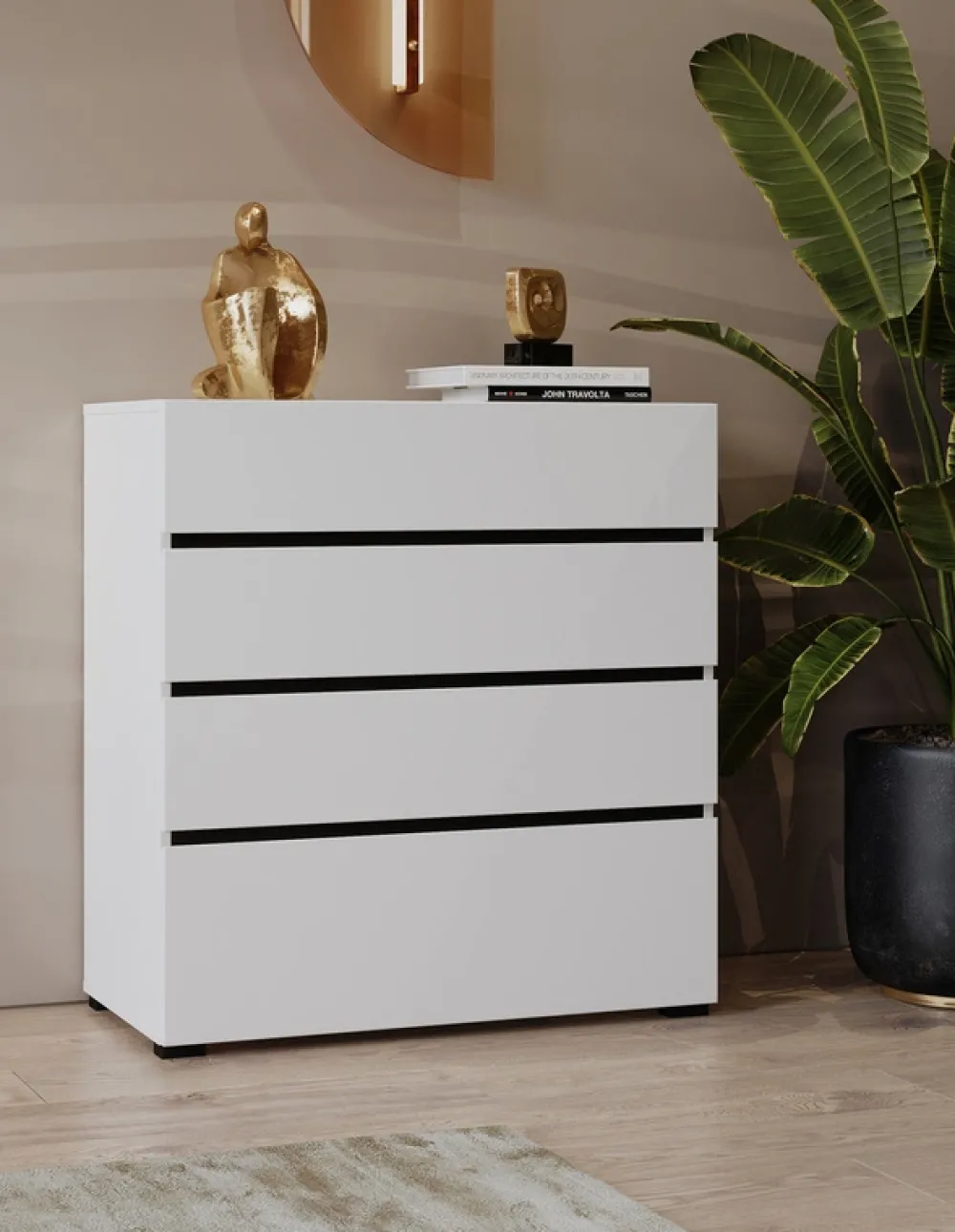Ta praktyczna komoda z czterema szufladami to idealne rozwiązanie do salonu, sypialni lub przedpokoju. Jej uniwersalny design i solidne wykonanie sprawiają, że doskonale sprawdzi się zarówno w nowoczesnych, jak i klasycznych wnętrzach. Dzięki pojemnym szufladom zyskujesz mnóstwo miejsca do przechowywania – od ubrań i bielizny po dokumenty i drobiazgi.