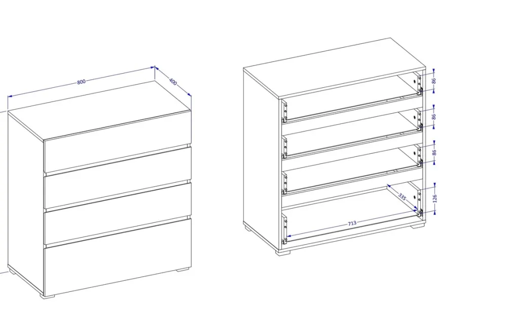 - Komoda z czterema pojemnymi szufladami na prowadnicach rolkowych to praktyczny mebel do każdego wnętrza. Obrzeża wykończone trwałą okleiną ABS gwarantują estetykę i odporność na uszkodzenia. Idealna do przechowywania i organizacji.