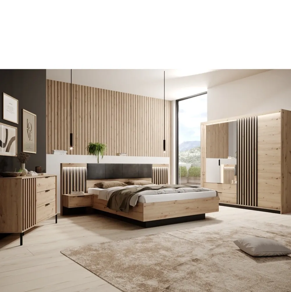 Zanurz się w luksusie i komforcie z naszym nowoczesnym zestawem mebli do sypialni TERAMO. Zestaw składa się z dużej szafy, łóżka, komody oraz dwóch stolików nocnych.