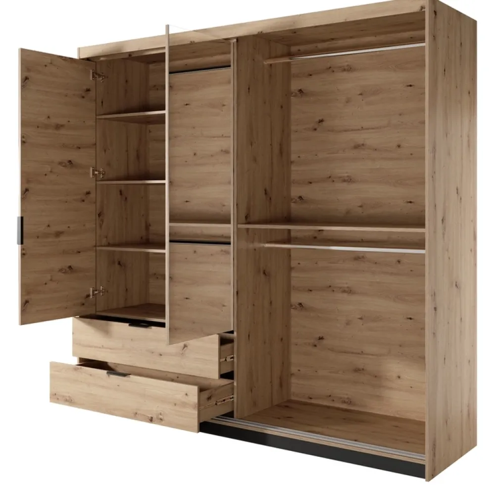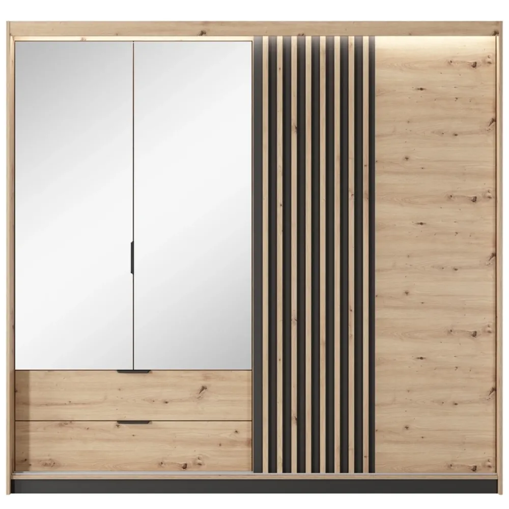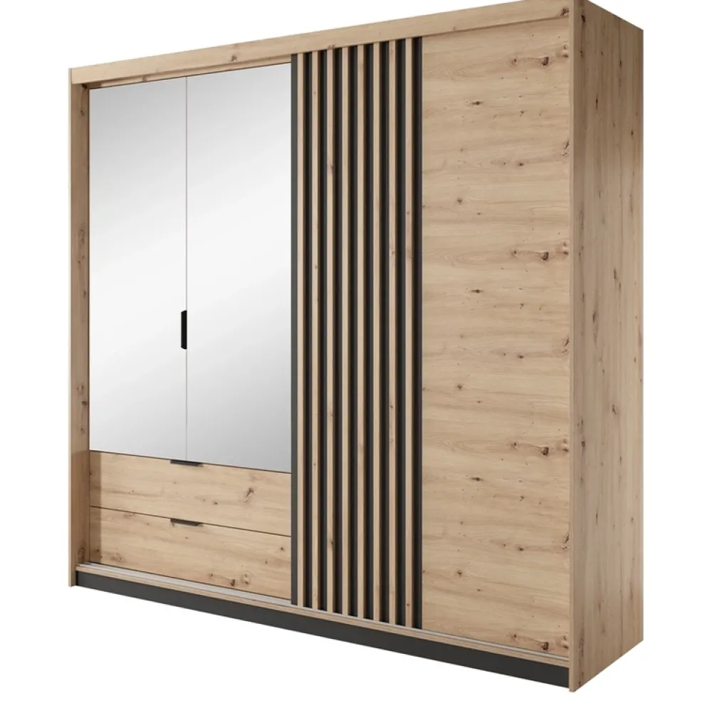 Szafa jest prawdziwym klejnotem tego zestawu, z lustrem i dekoracyjnymi lamelami, które dodają jej eleganckiego, nowoczesnego wyglądu.
