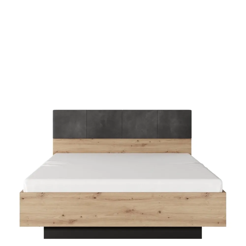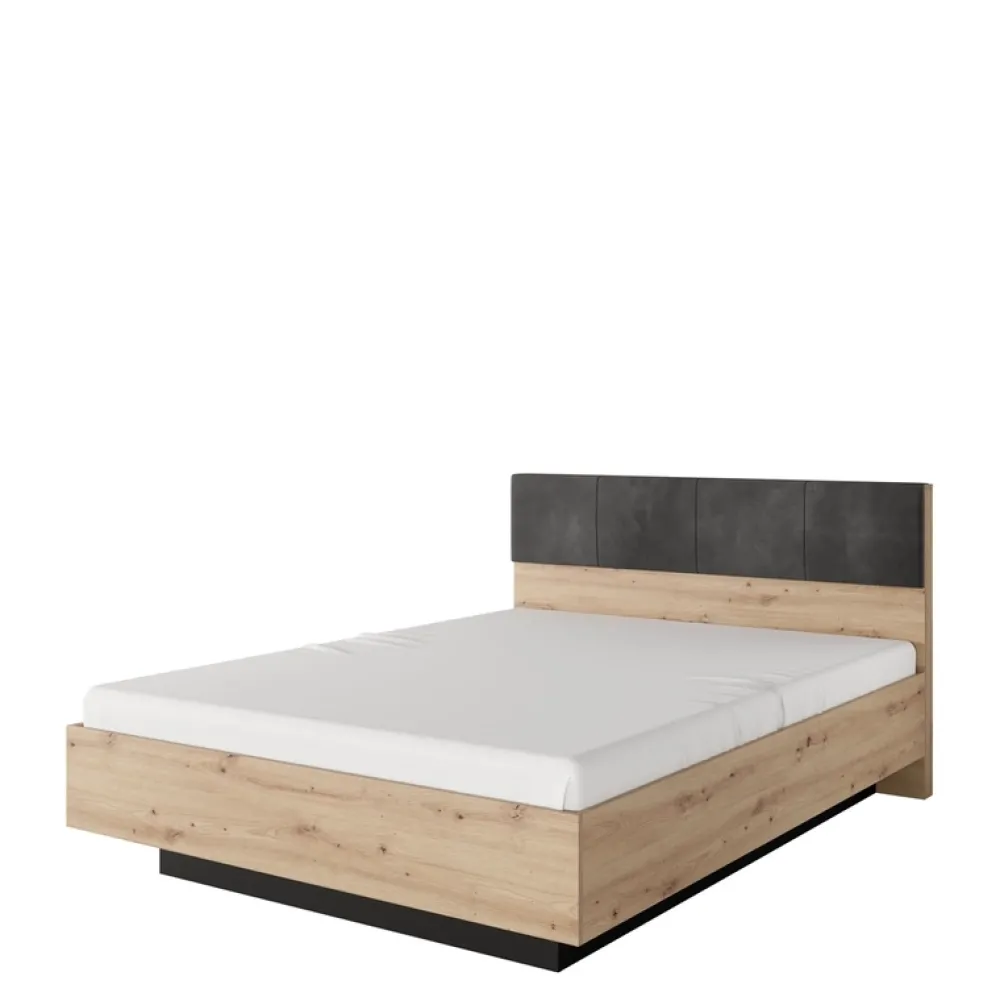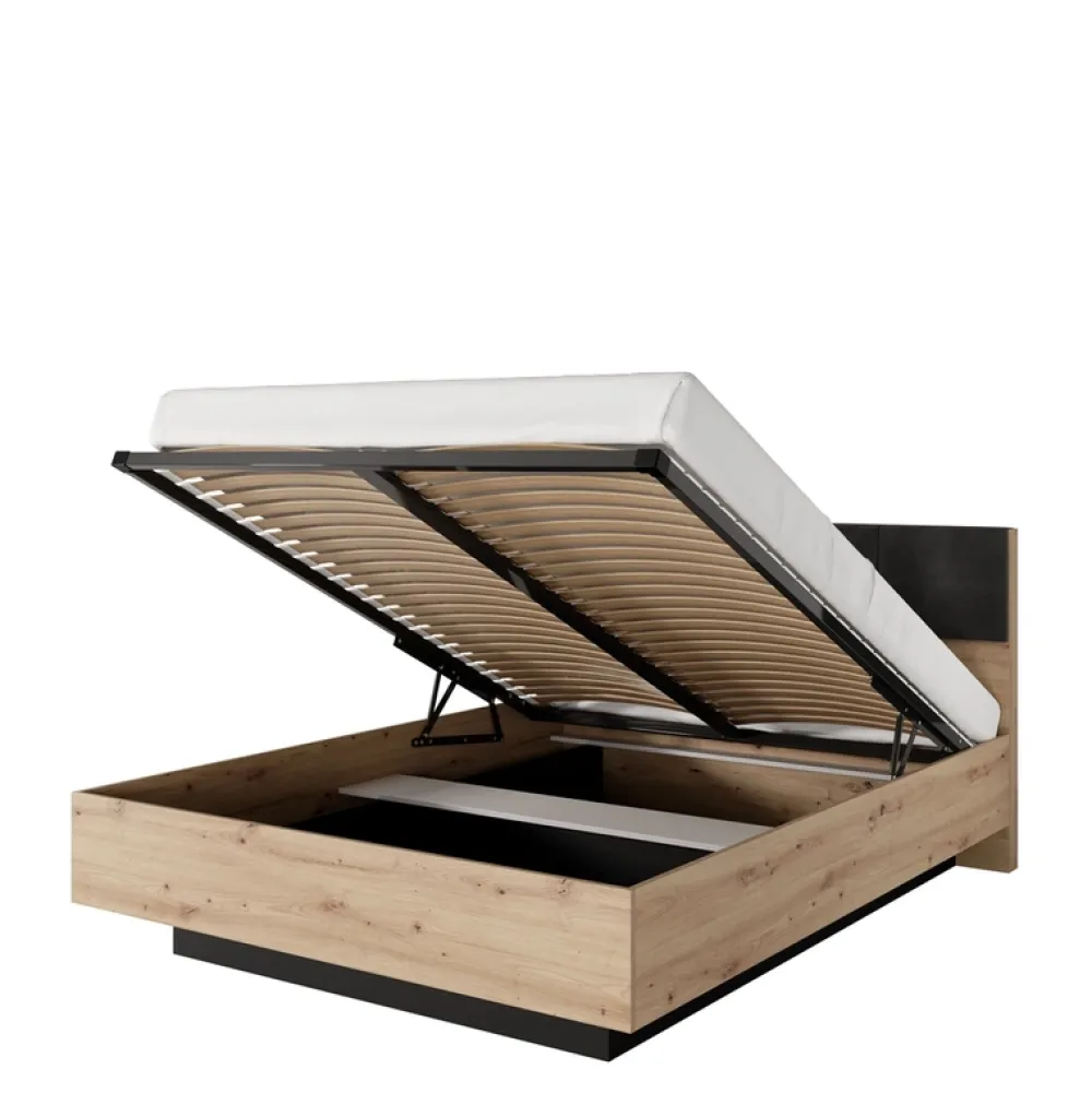 Łóżko posiada tapicerowany zagłówek, który dodaje mu luksusowego wyglądu, a pojemnik na pościel zapewnia dodatkowe miejsce na przechowywanie.