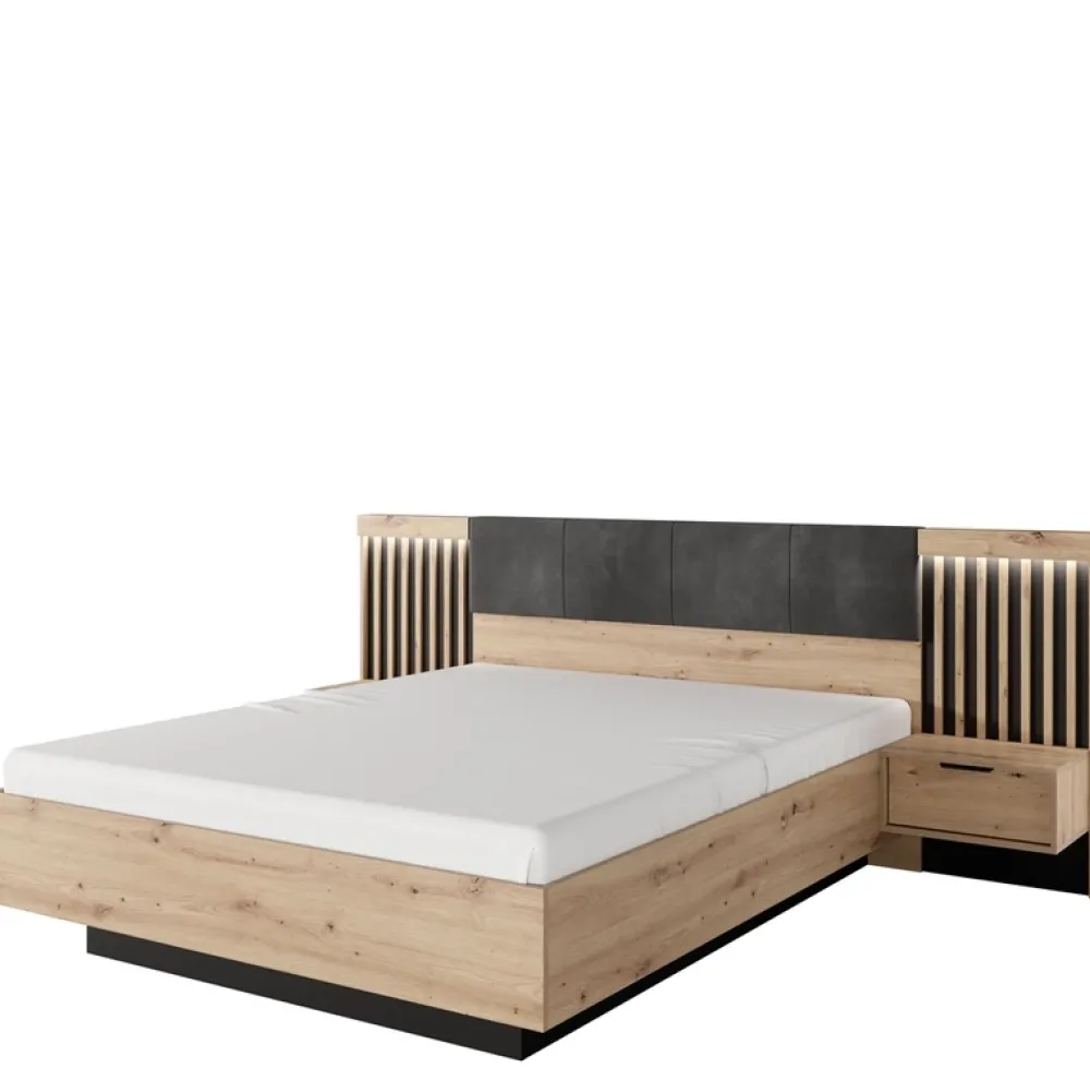 Komoda z dekoracyjnymi lamelami na froncie drzwi jest nie tylko praktyczna, ale także stanowi stylowy element dekoracyjny. Dodatkowo dwie szafki nocne z szufladami i pionowymi lamelami na antracytowym tle są idealnym miejscem na nocne książki czy budzik.
