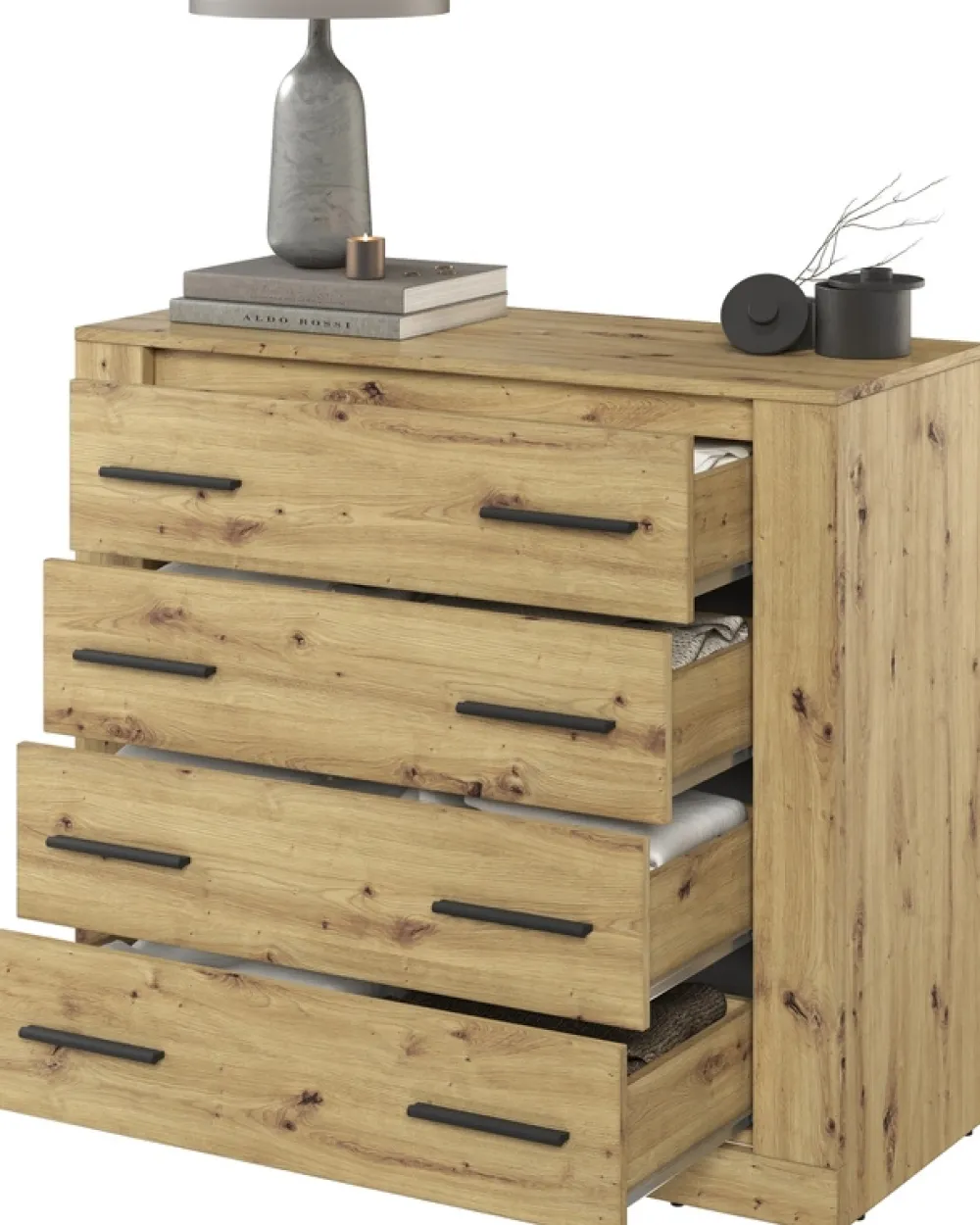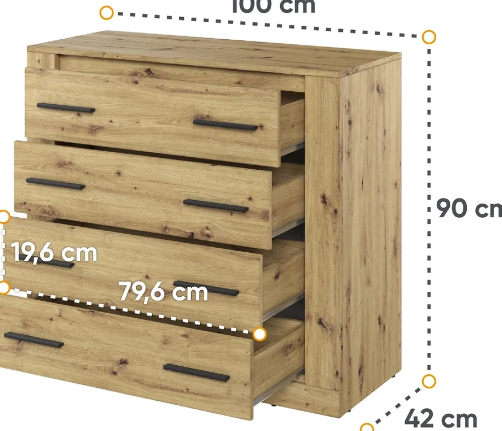 - Komoda z szufladami ARTI została wykonana w kolorze dąb artisan, z czarnymi uchwytami które dopełniają nowoczesną stylistykę. Szuflady komody zostały osadzone na prowadnicach rolkowych, które gwarantują płynną oraz cichą pracę.