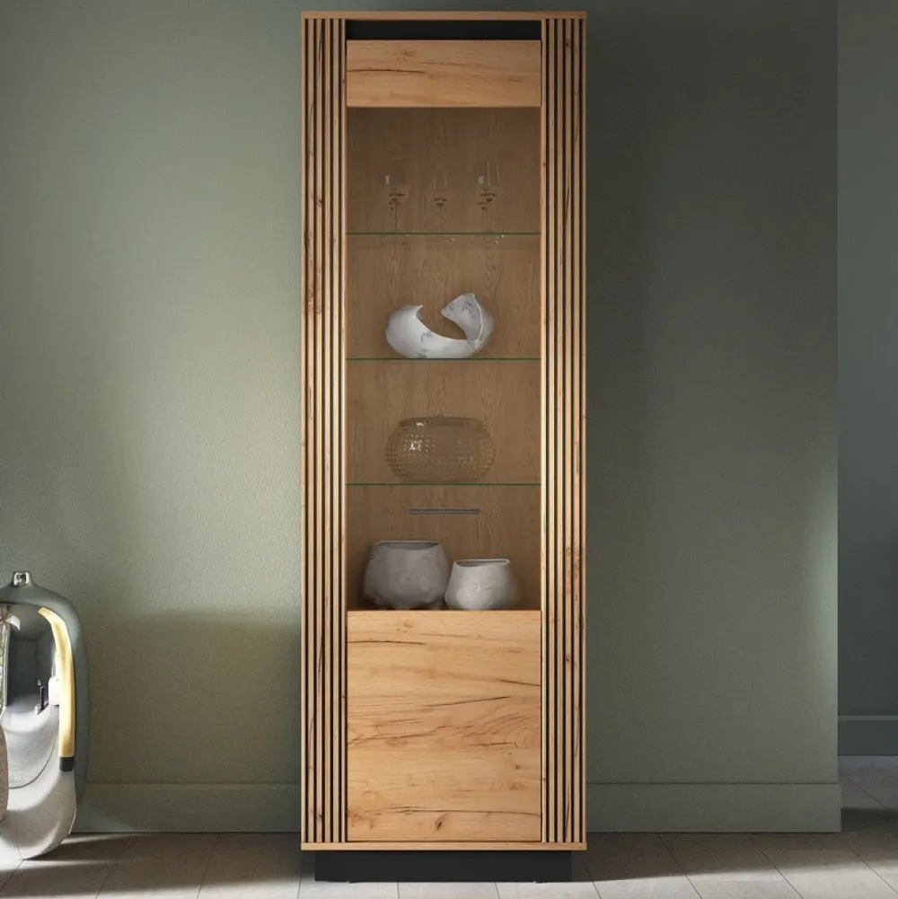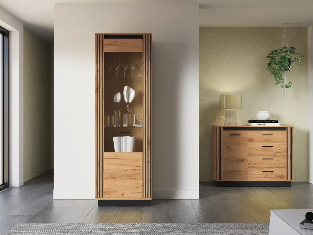 Witryna loftowa UMIO w kolorze dąb craft złoty z czarnymi akcentami to idealny wybór dla miłośników nowoczesnych, industrialnych wnętrz. Dzięki przeszklonym drzwiom i subtelnym lamelom eksponuje dekoracje z klasą, jednocześnie oferując praktyczne miejsce do przechowywania. To połączenie stylu, solidności i komfortu codziennego użytkowania.