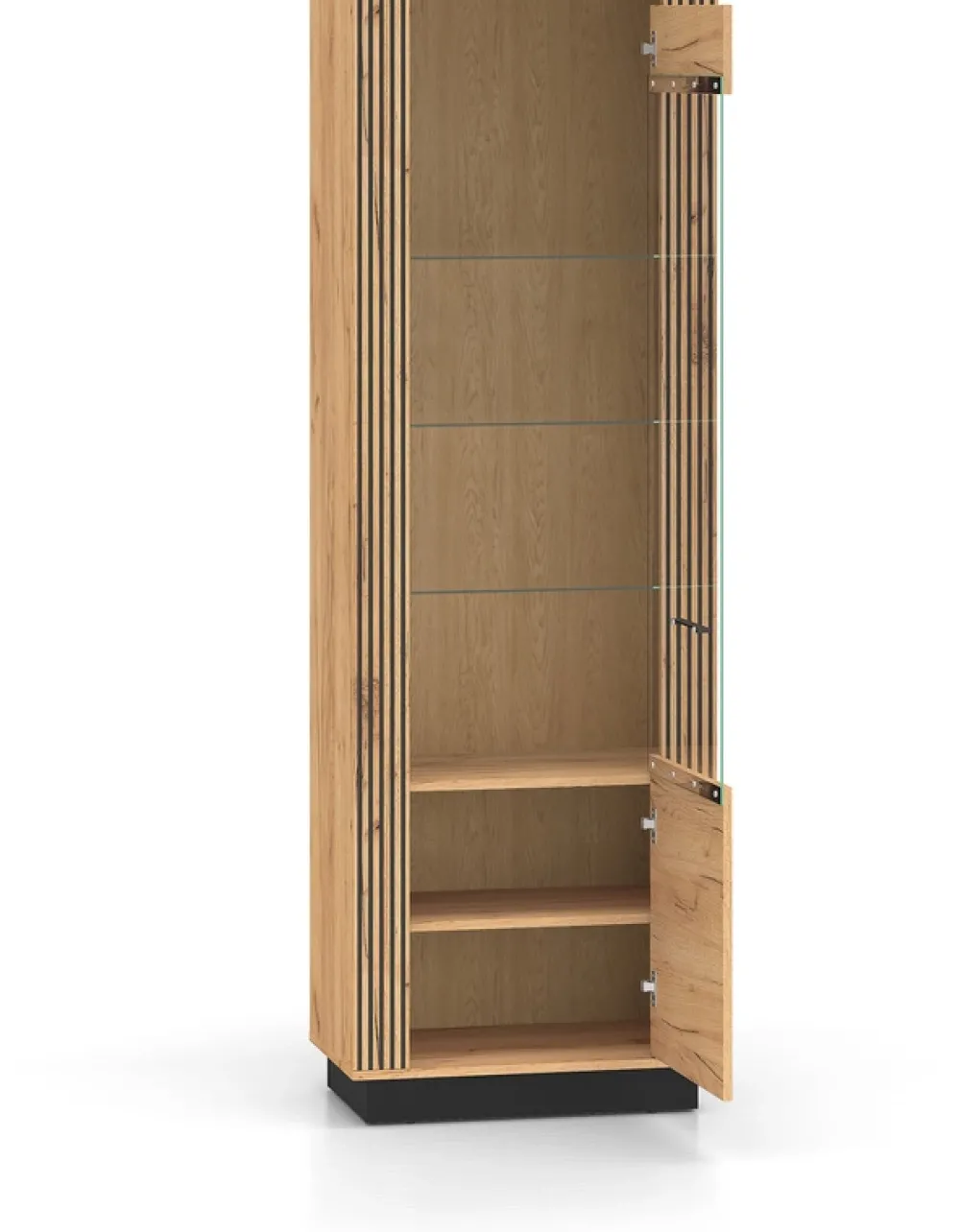 - Witryna 1-drzwiowa w kolorze dąb craft złoty z czarnymi detalami i przeszklonym frontem. Wyposażona w trzy szklane półki, dwie półki z płyty oraz system cichego domyku. Opcjonalne oświetlenie LED dodaje elegancji. Idealna do salonu lub jadalni.