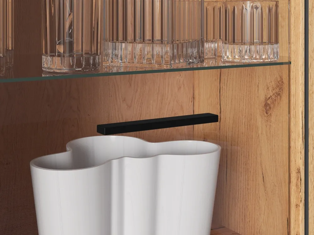 Witryna UMIO to doskonały wybór zarówno do salonu, jak i jadalni. Czarna oprawa kontrastująca z naturalnym odcieniem drewna przyciąga wzrok i świetnie komponuje się z nowoczesnymi aranżacjami. Zastosowane obrzeża ABS to specjalne wykończenie krawędzi mebla, które chroni je przed uszkodzeniami mechanicznymi, wilgocią i codziennym zużyciem – zwiększając tym samym trwałość i estetykę produktu.