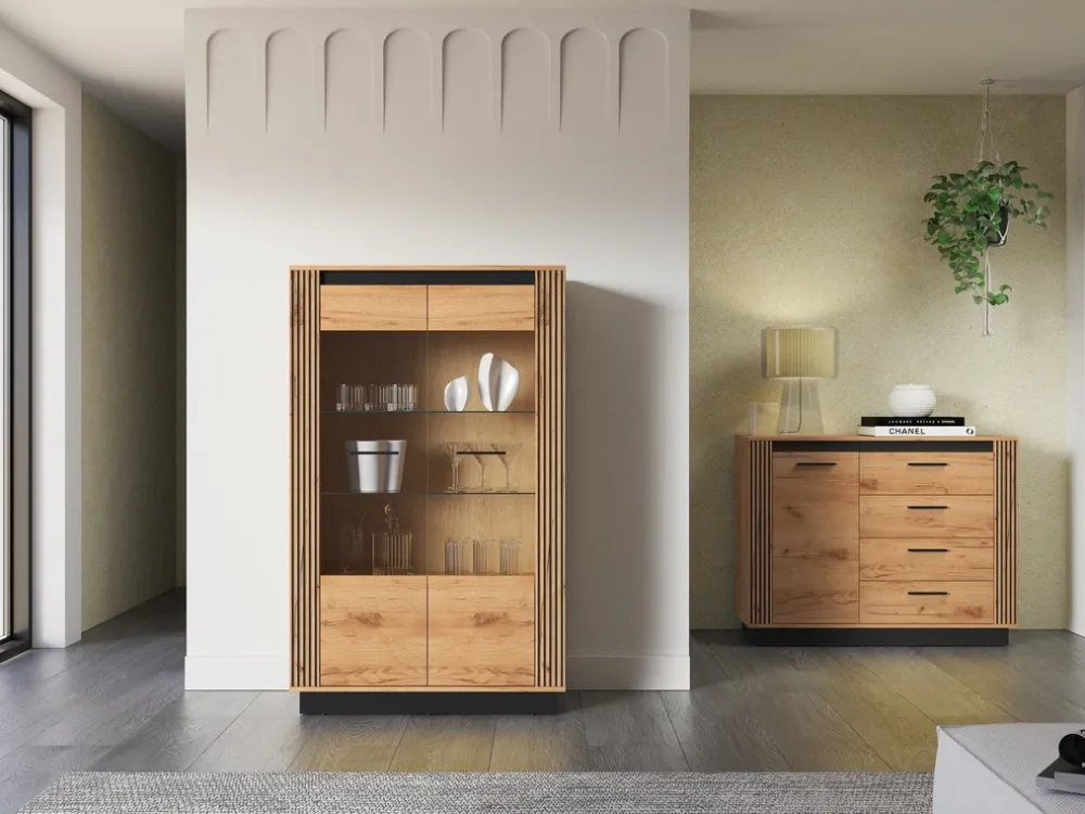 Precyzyjne wykończenie, czarne uchwyty i delikatne, nowoczesne linie sprawiają, że mebel wpisuje się w aktualne trendy wnętrzarskie. Możliwość doboru oświetlenia LED pozwala dodatkowo podkreślić wyjątkowy charakter ekspozycji – od porcelany po kolekcję szkła czy drobne dzieła sztuki.