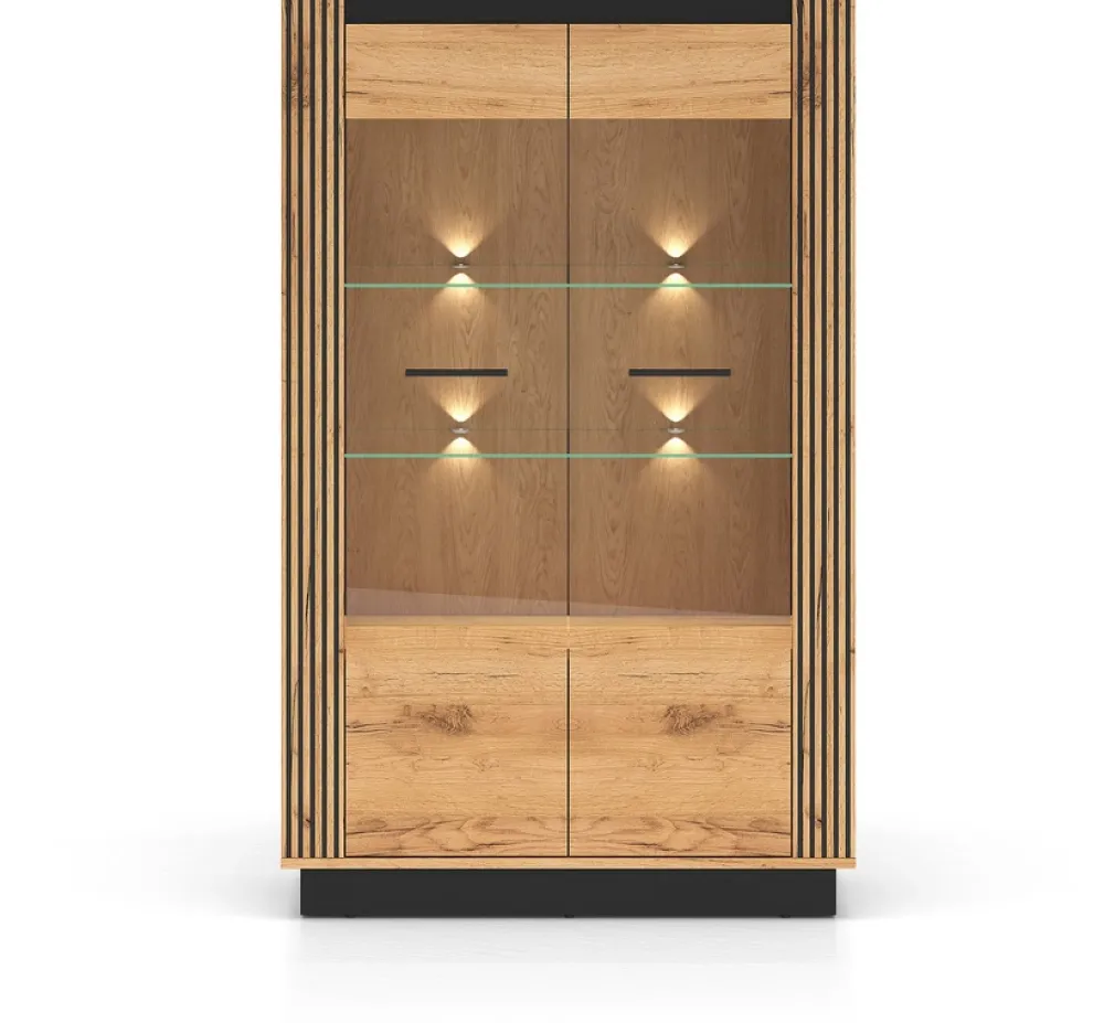 - Witryna dwudrzwiowa w kolorze dąb craft złoty z czarnymi detalami i przeszklonym frontem. Wyposażona w dwie szklane półki, półkę z płyty oraz system cichego domyku. Opcjonalne oświetlenie LED dodaje elegancji. Idealna do salonu lub jadalni.