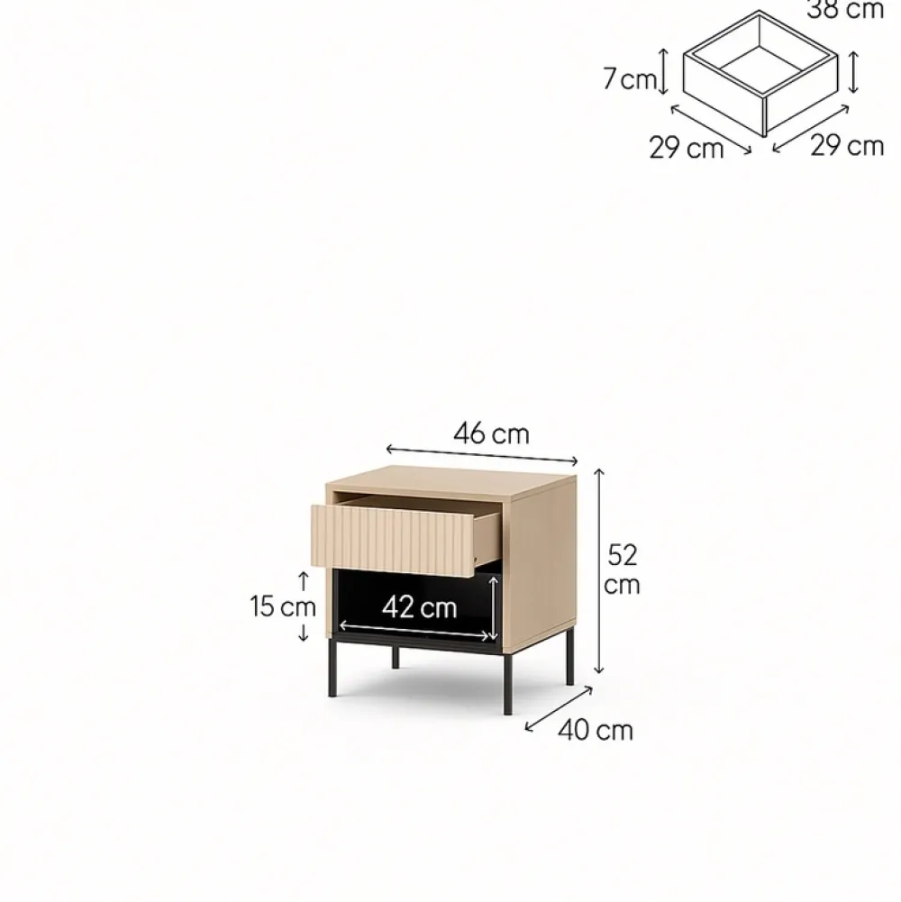 Stylowa i funkcjonalna szafka nocna TREND to idealny dodatek do nowoczesnej sypialni. Jej ryflowany front, smukłe metalowe nóżki i kontrastowa kolorystyka beżu piaskowego z czernią tworzą wyjątkowy mebel, który przyciąga wzrok. Niewielka szuflada i otwarta wnęka zapewniają miejsce na drobiazgi, które warto mieć pod ręką – od książek po ładowarkę czy okulary.