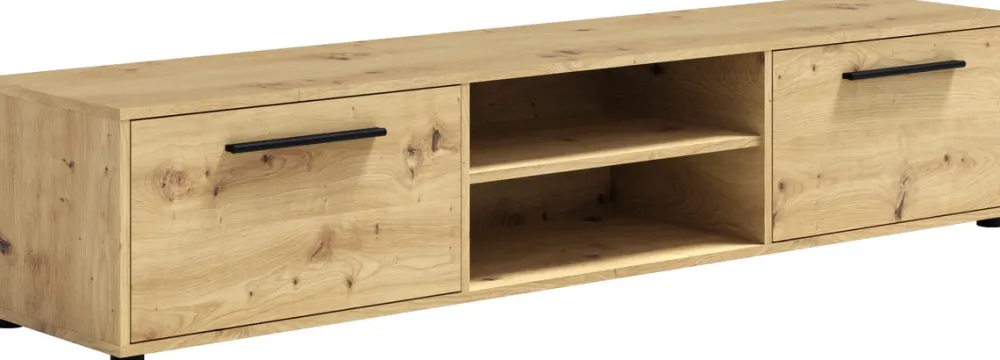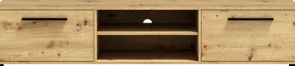 - Szafka RTV MAXIDO 190 cm Wyposażona w 2 klapy otwierane do dołu, otwartą półkę z otworem na kable oraz konstrukcję z płyty wiórowej 16 mm. Kolor dąb artisan z czarnymi uchwytami. Idealna pod telewizor oraz do średnich i dużych przestrzeni.