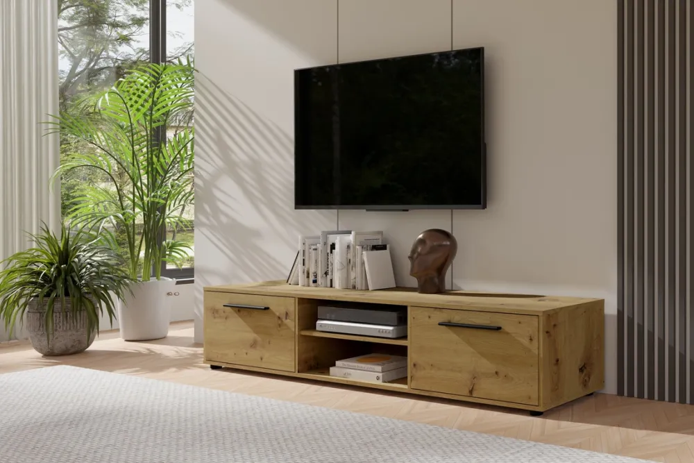Szafka RTV MAXIDO w dekorze dąb artisan to idealne połączenie funkcjonalności i ponadczasowego uroku drewna. Ciepły odcień i naturalna struktura sprawiają, że mebel wprowadza do wnętrza przytulność i domowy charakter. To stylowe rozwiązanie zarówno do nowoczesnych, jak i klasycznych aranżacji.
