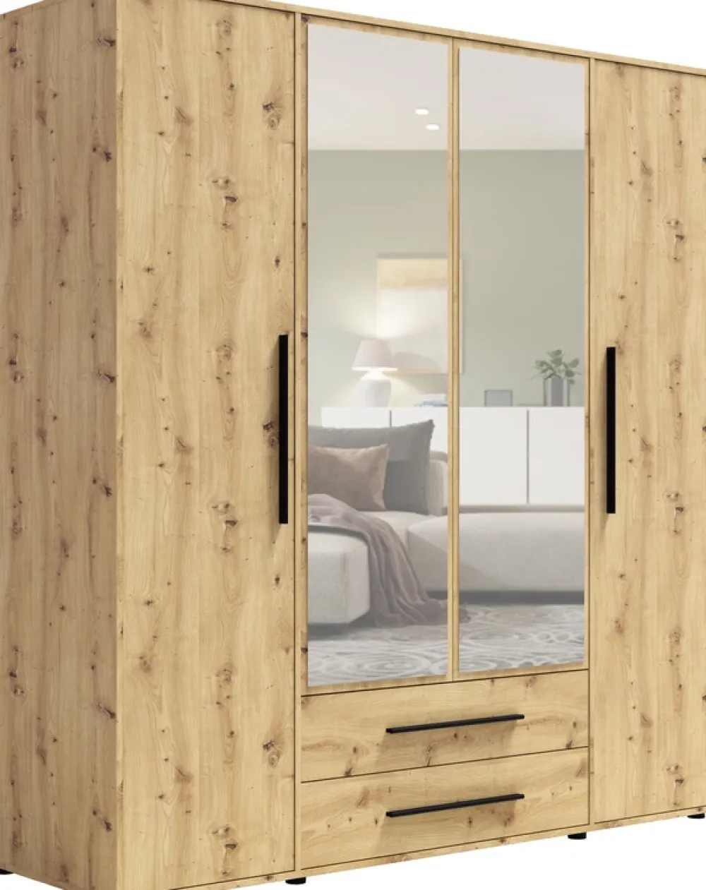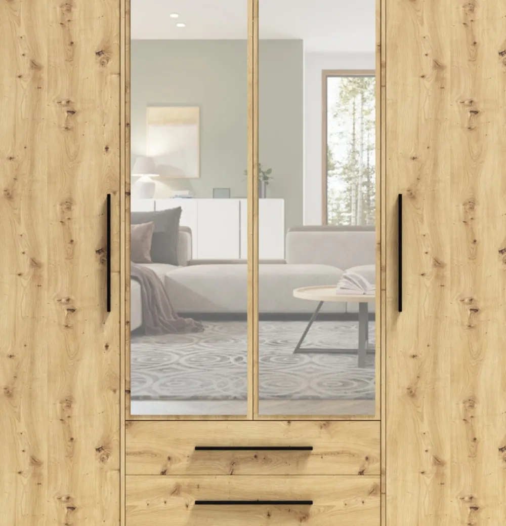 - Szafa MAXIDO dąb artisan z lustrem to mebel łączący funkcjonalność z naturalnym stylem. 4 drzwi (2 z lustrem), 2 drążki, 6 półek i 2 szuflady zapewniają porządek. Solidna konstrukcja z płyty wiórowej 16 mm, z systemem „push to open”. Idealna do sypialni.