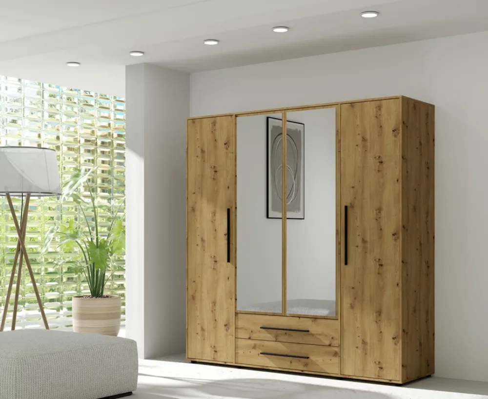 Szafa czterodrzwiowa z lustrem MAXIDO dąb artisan – ciepły akcent i praktyczne przechowywanie