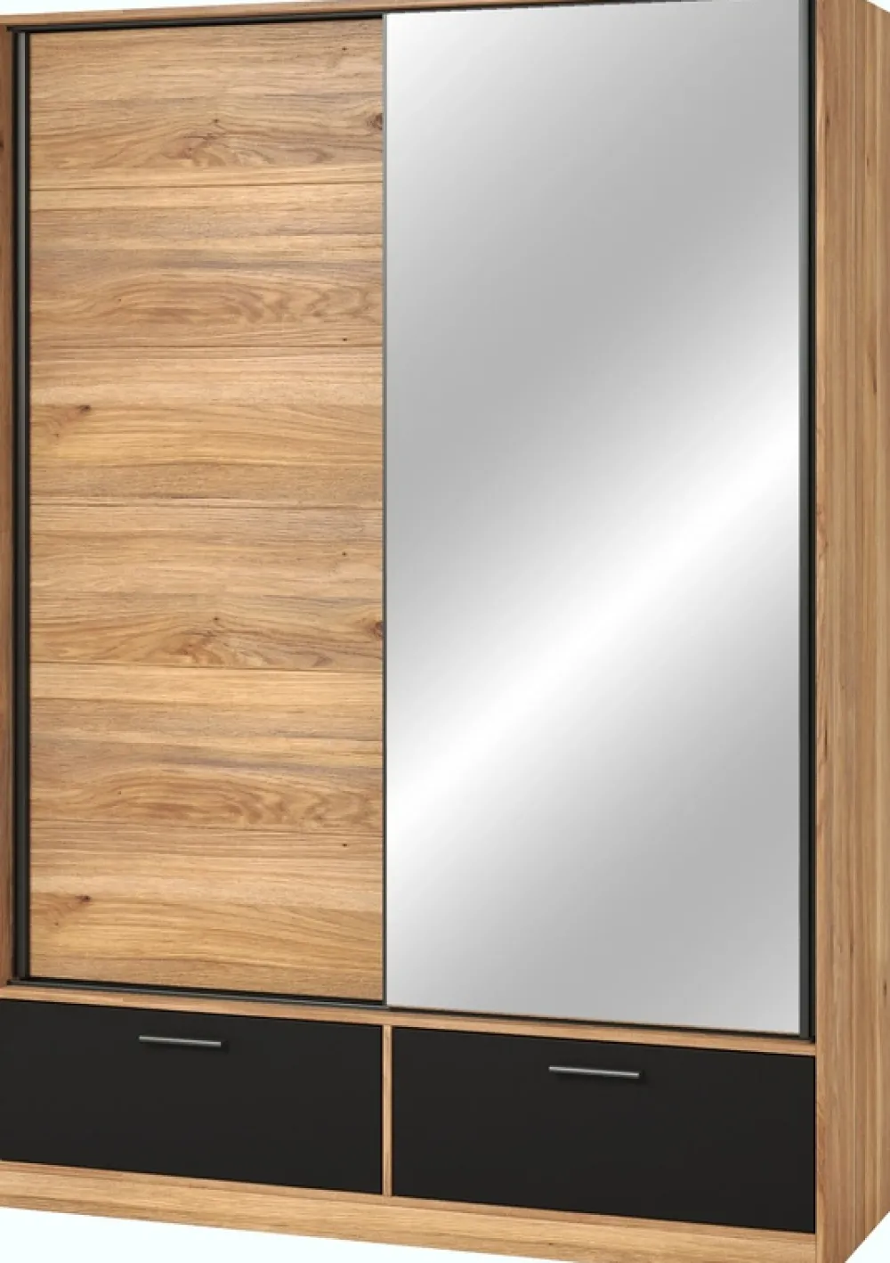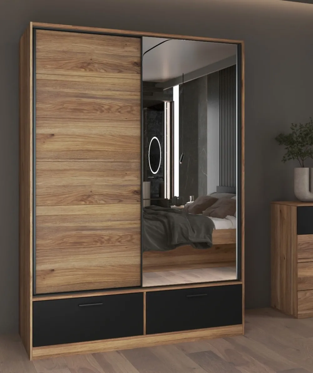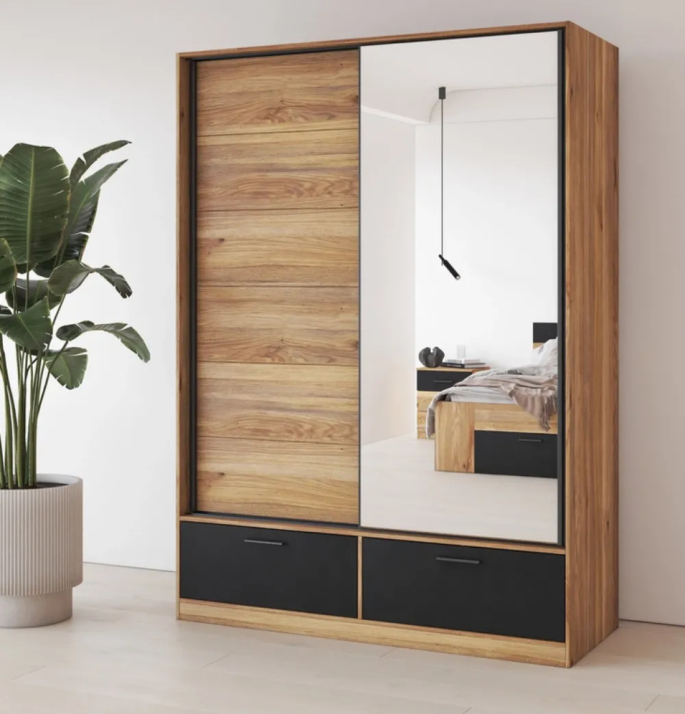 - Szafa przesuwna z lustrem BETA o szerokości 150 cm posiada wszystko, czego potrzebujesz do swojej sypialni. Szafa przesuwna z lustrem posiada dwie pojemne szuflady, drążek na wieszaki oraz przestronne półki na ubrania. Szafa w kolorze dąb mauvella.