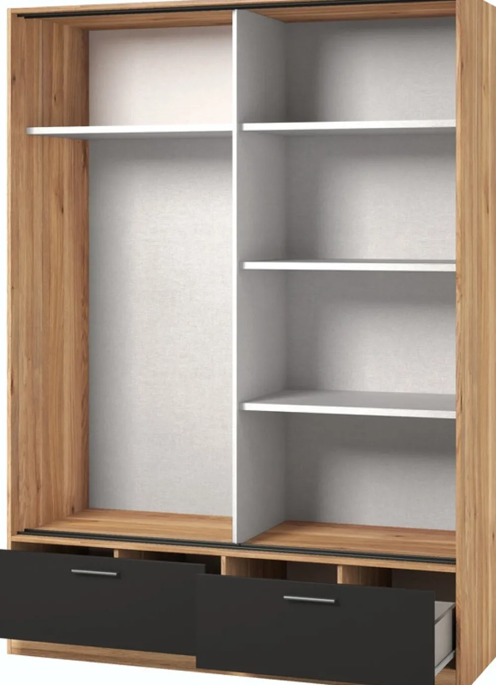 Wnętrze szafy zostało zaprojektowane z myślą o maksymalnej funkcjonalności. Drążek na ubrania pozwala na wygodne wieszanie płaszczy, sukienek i koszul, zapewniając im odpowiednią ilość miejsca. Szafa przesuwna posiada także praktyczne półki, które umożliwiają uporządkowane przechowywanie swetrów, t-shirtów, torebek czy innych akcesoriów. Dodatkowo na dole szafy znajdują się dwie przestronne szuflady, idealne do przechowywania bielizny, skarpetek lub innych drobnych przedmiotów.
