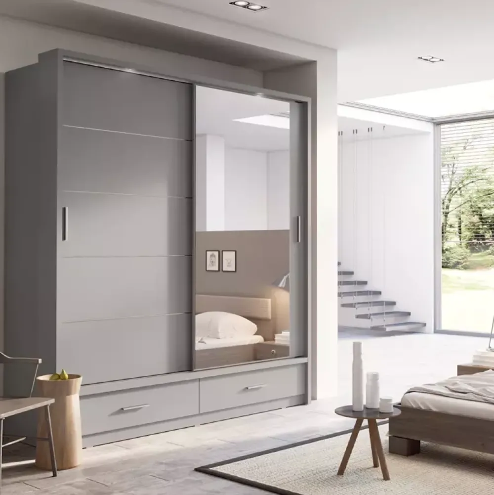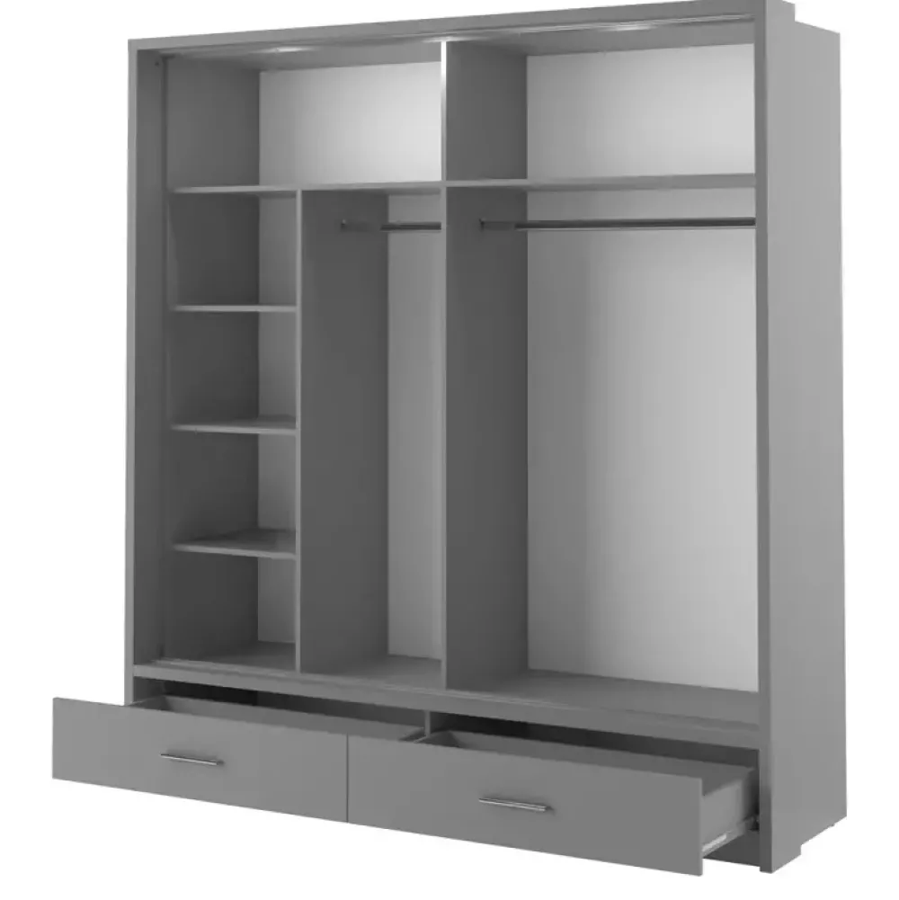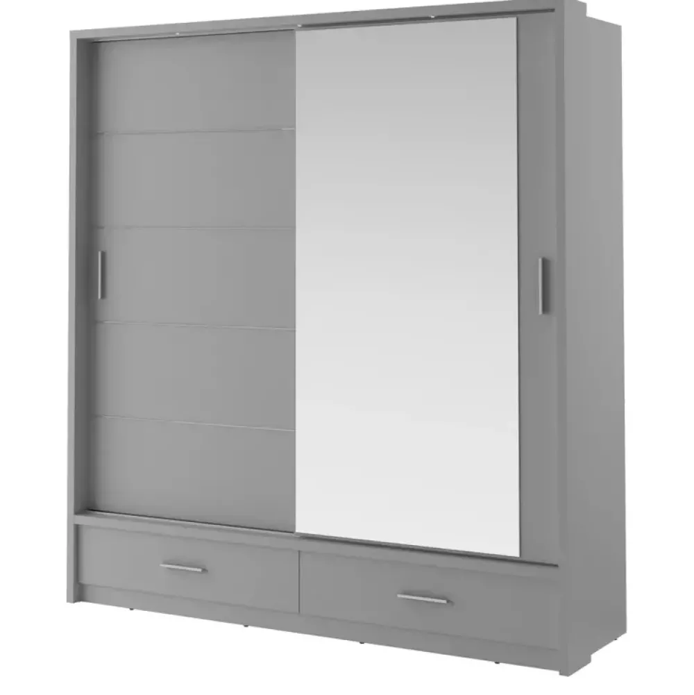 Szafa przesuwna ARTI została wyposażona we dwie pojemne szuflady osadzone na prowadnicach rolkowych, które doskonale sprawdzą się do umieszczenia rozmaitych akcesoriów oraz elementów garderoby. Szafa przesuwna do sypialni została również wyposażona w parę drzwi znajdujących się ponad szufladami, z których prawe drzwi przesuwne zostały wzbogacone o lustro, które doskonale rozjaśnia, oraz optycznie powiększa pomieszczenie.