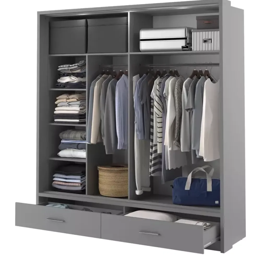 Za drzwiami szafy do sypialni znajdują się dwa metalowe drążki na wieszaki z ubraniami o różnej długości. Szafa przesuwna z lustrem posiada również pięć półek znajdujących się za centralnymi drzwiami oraz po półce nad drążkiem na wieszaki. Dodatkowo szafa przesuwna do sypialni, dzięki swojej niebanalnej oraz nowoczesnej stylistyce doskonale wpisuje się we współczesne trendy aranżacji wnętrz.