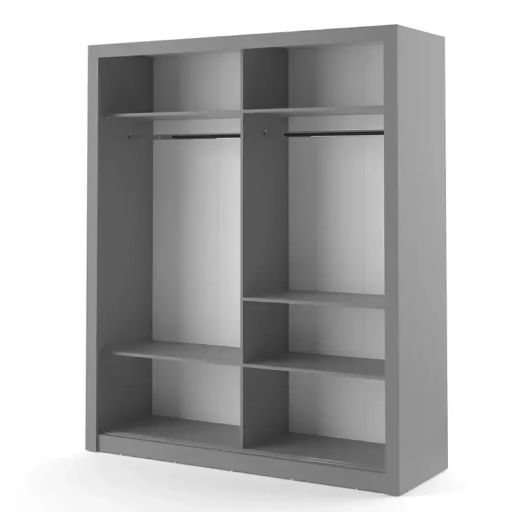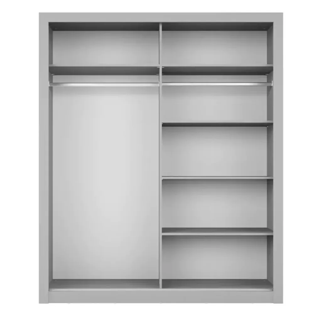 Dwudrzwiowa szafa przesuwna z lustrem ARTI została wyposażona w lustro o nowoczesnym kształcie, które optycznie powiększa, oraz rozjaśnia pomieszczenie w niepowtarzalny sposób. Szafa przesuwna do sypialni posiada również pięć praktycznych półek, które znakomicie sprawdzą się do zagospodarowania rozmaitymi elementami garderoby.