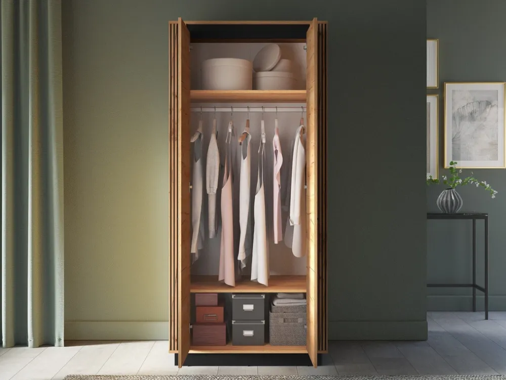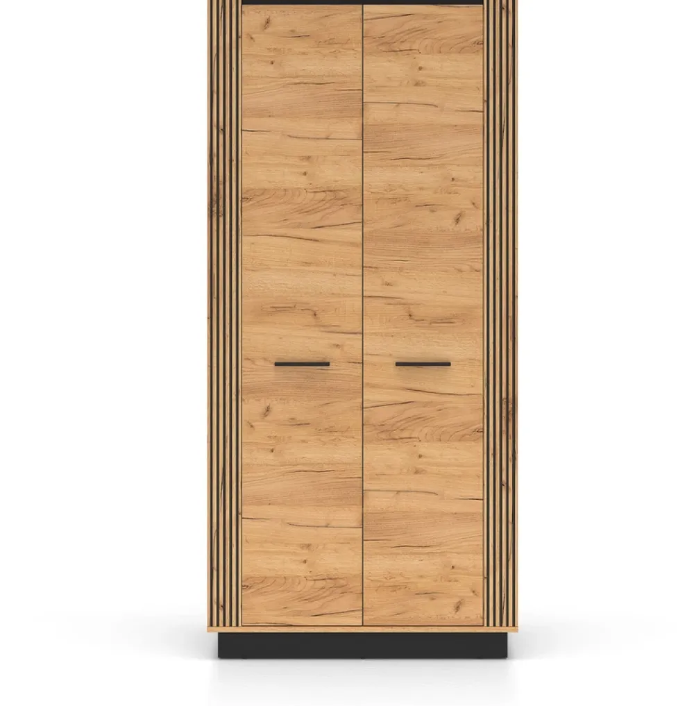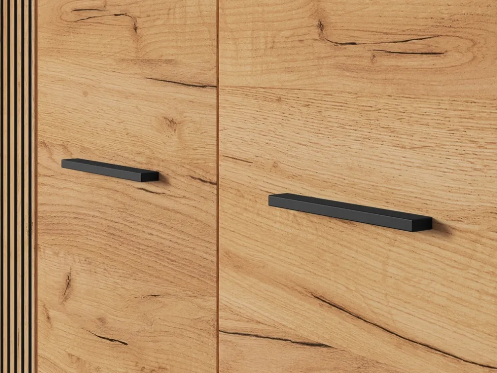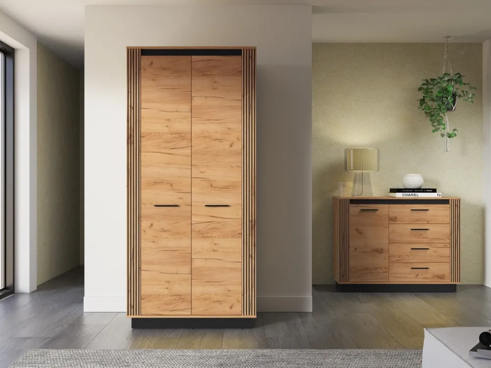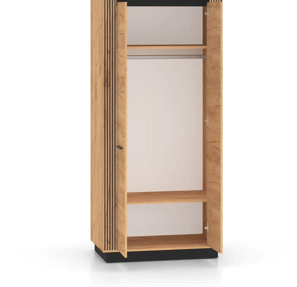 Stylowa szafa w dekorze dąb craft złoty z czarnymi detalami to doskonały wybór do mniejszych wnętrz, w których liczy się każdy centymetr. Prosta, elegancka forma kryje w sobie funkcjonalne wnętrze z drążkiem na wieszaki i dwiema pojemnymi półkami – idealne do przechowywania odzieży codziennej, pudeł czy dodatków.