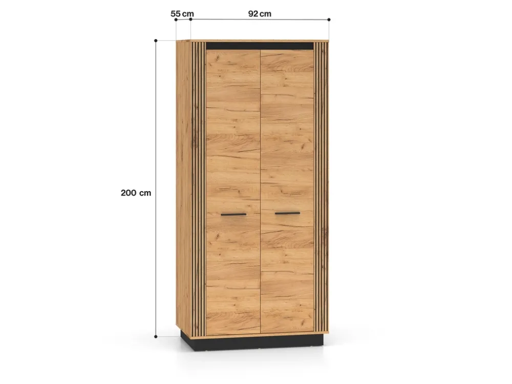 - Dwudrzwiowa szafa w kolorze dąb craft złoty i czarny z drążkiem na ubrania i dwiema pojemnymi półkami. Idealna do mniejszych pomieszczeń. Posiada system cichego domyku, trwałą laminowaną płytę i nowoczesny wygląd. Kompaktowa, ale pojemna.