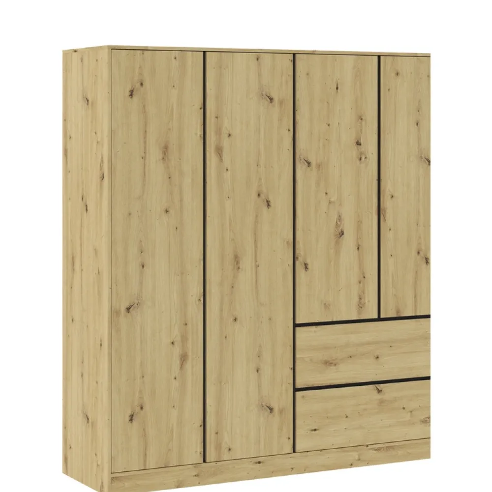 - Szafa BALVIO 195 cm w dekorze dąb artisan to pojemny i elegancki mebel do sypialni. Zawiera 2 drążki, 4 półki i 2 szuflady, a bezuchwytowe fronty podkreślają jej nowoczesny charakter.