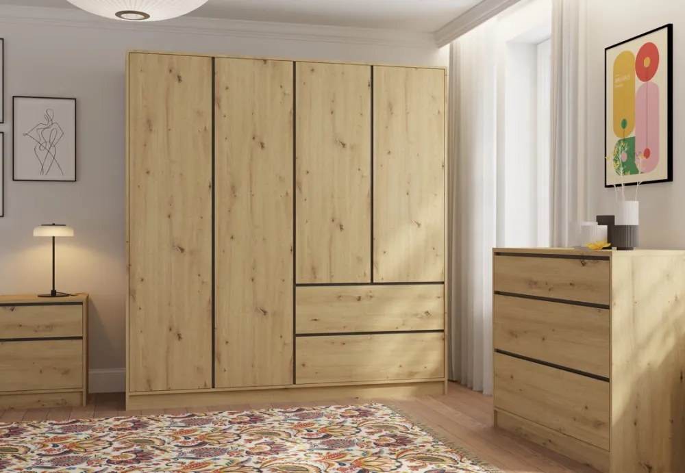 Szafa do sypialni BALVIO 195 cm to harmonijne połączenie elegancji i funkcjonalności, które odmieni każdą przestrzeń. Jej przemyślana konstrukcja z dwiema szufladami, półkami i drążkami na ubrania sprawia, że bez trudu uporządkujesz całą garderobę – od codziennych ubrań po sezonowe dodatki. Wykończenie w ciepłym dekorze dąb artisan nadaje wnętrzu naturalnego charakteru i przytulności.