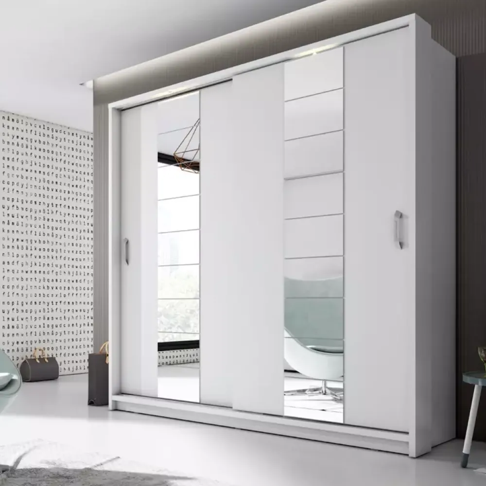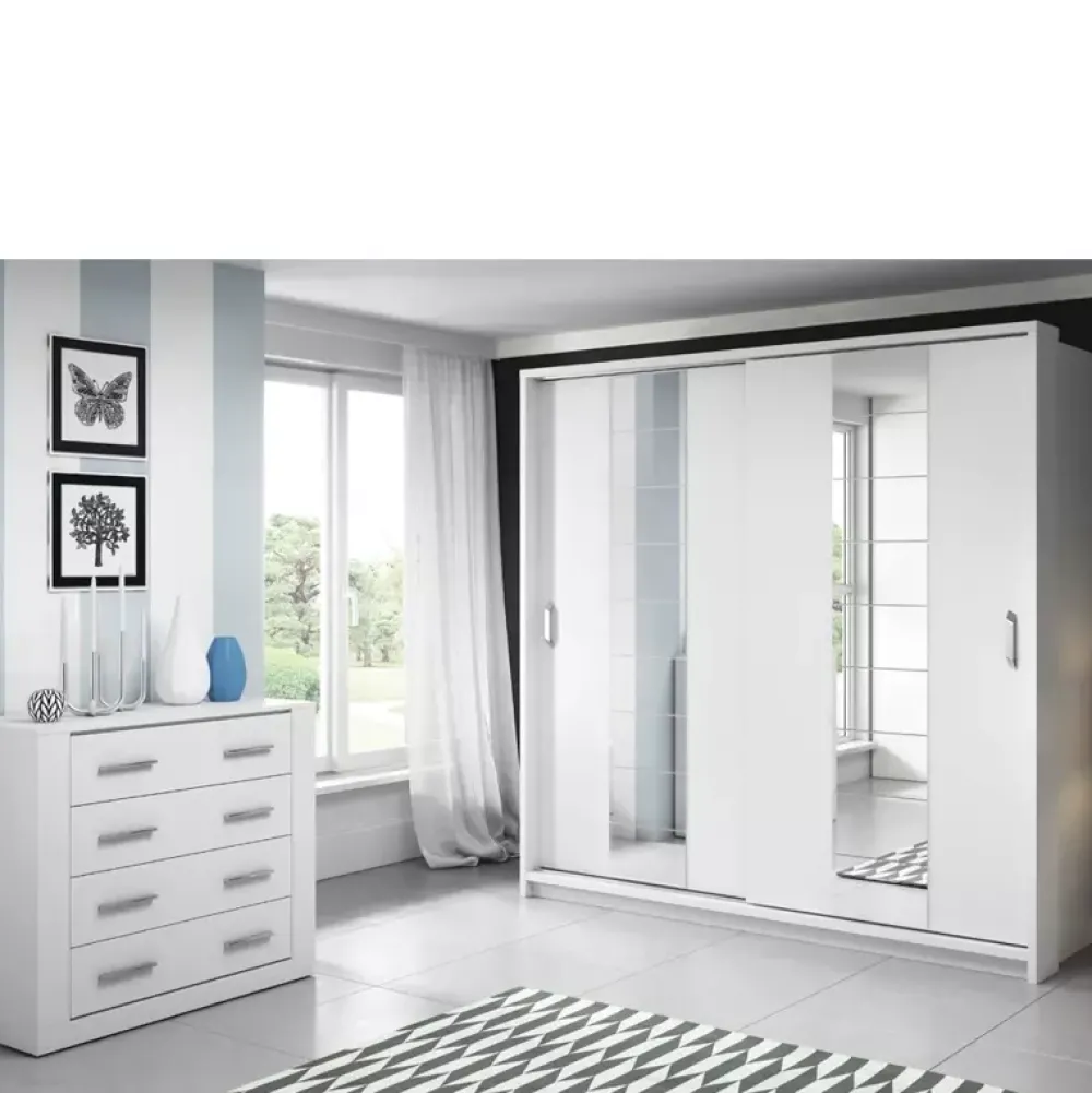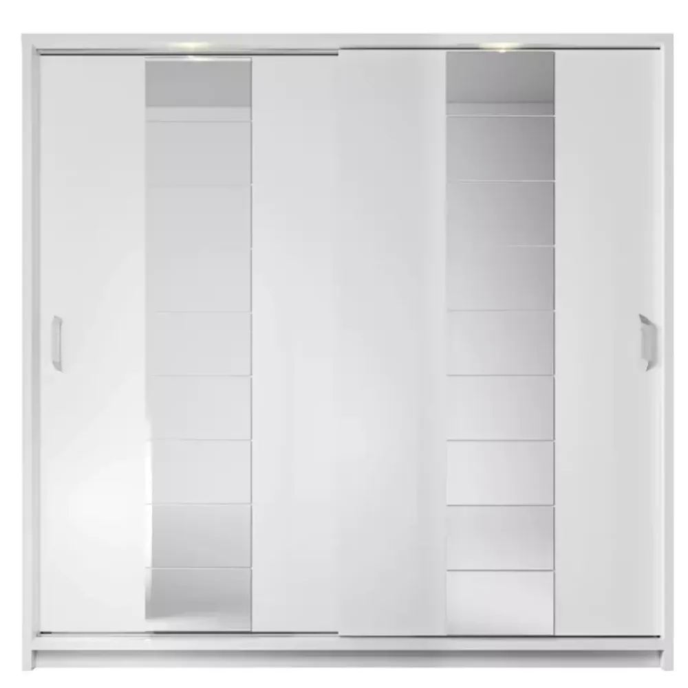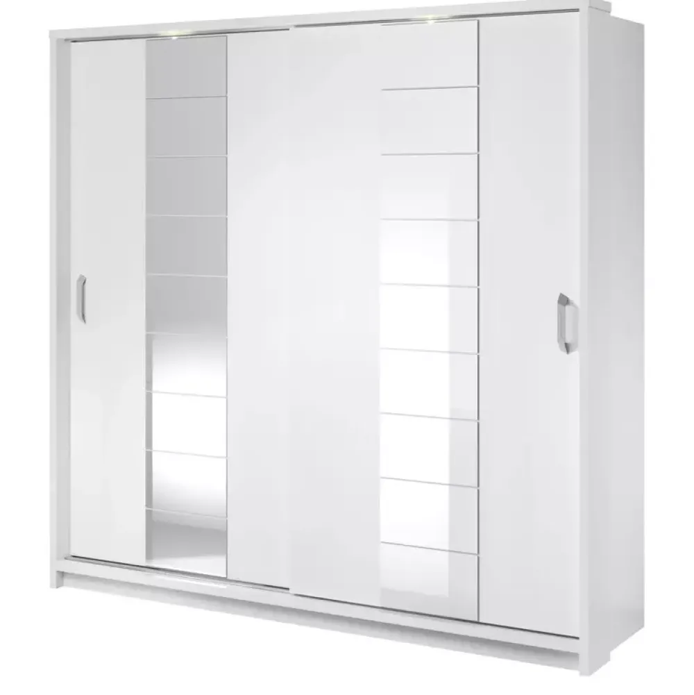 - Biała szafa przesuwna z lustrem ARTI to propozycja, która dzięki swojej stylistyce doskonale wpisze się w każdą aranżację pomieszczenia. Szafa posiada trzy drzwi w formie lustra oraz sześć półek i dwa metalowe drążki na wieszaki z ubraniami.