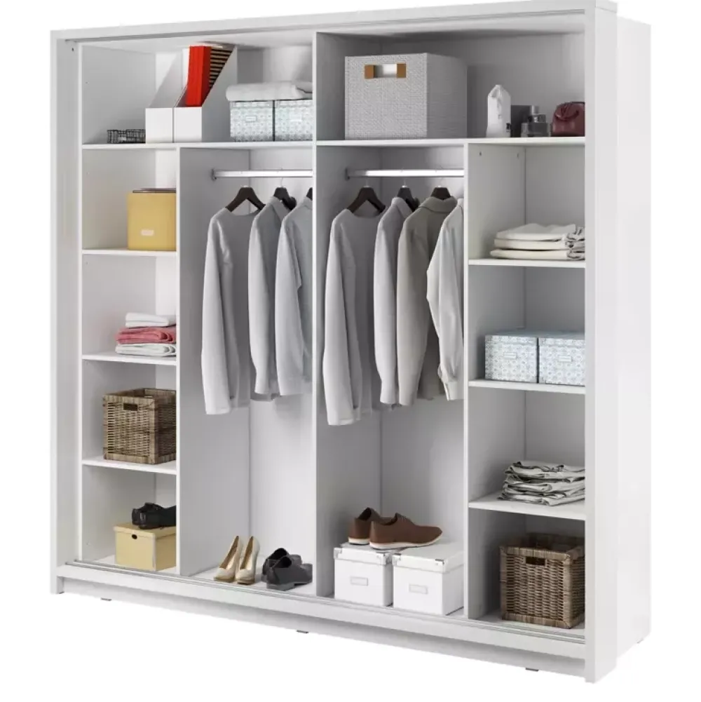 Szafa przesuwna ARTI została wyposażona w dwoje drzwi które zostały wzbogacone o lustra w nowoczesnym kształcie doskonale rozjaśniające oraz optycznie powiększające pomieszczenie. Za drzwiami przesuwnymi szafy do sypialni znajdują się dwa metalowe drążki na wieszaki z ubraniami o różnej długości.