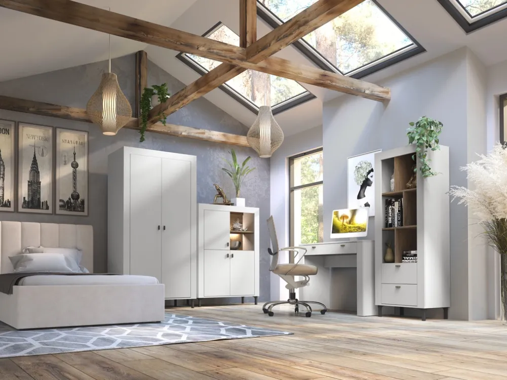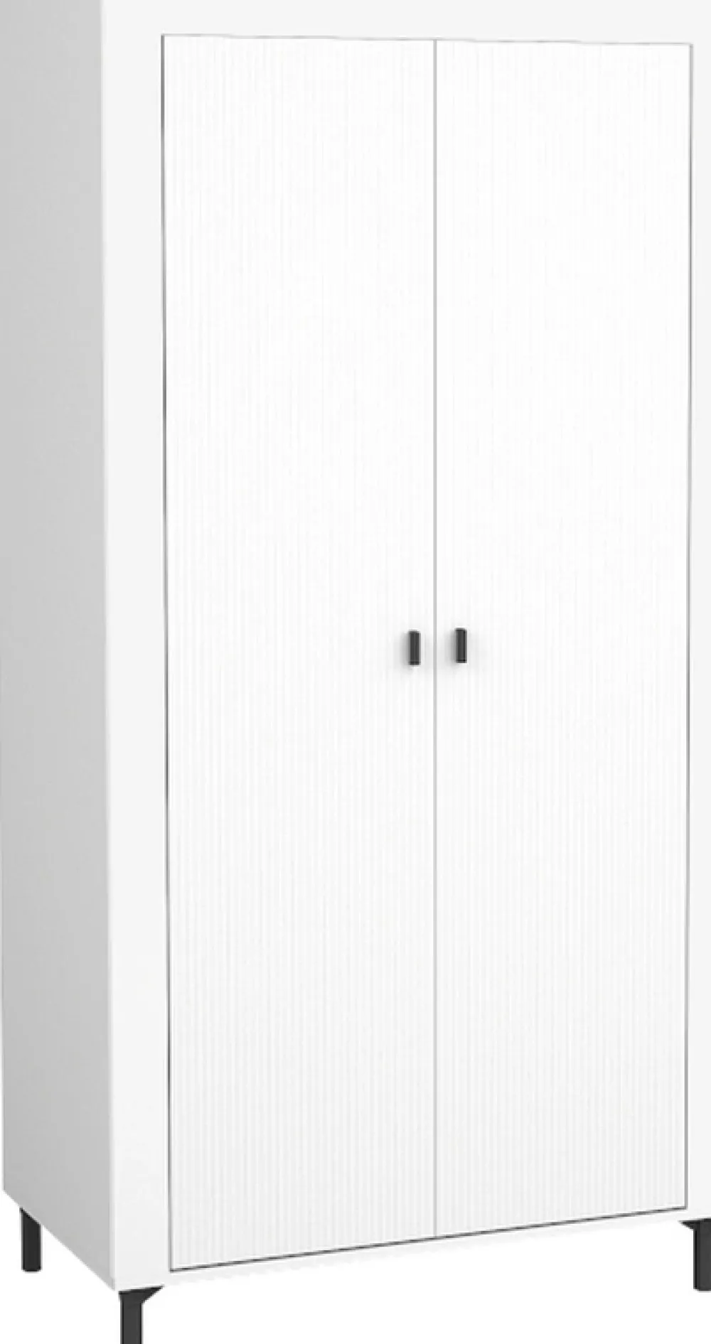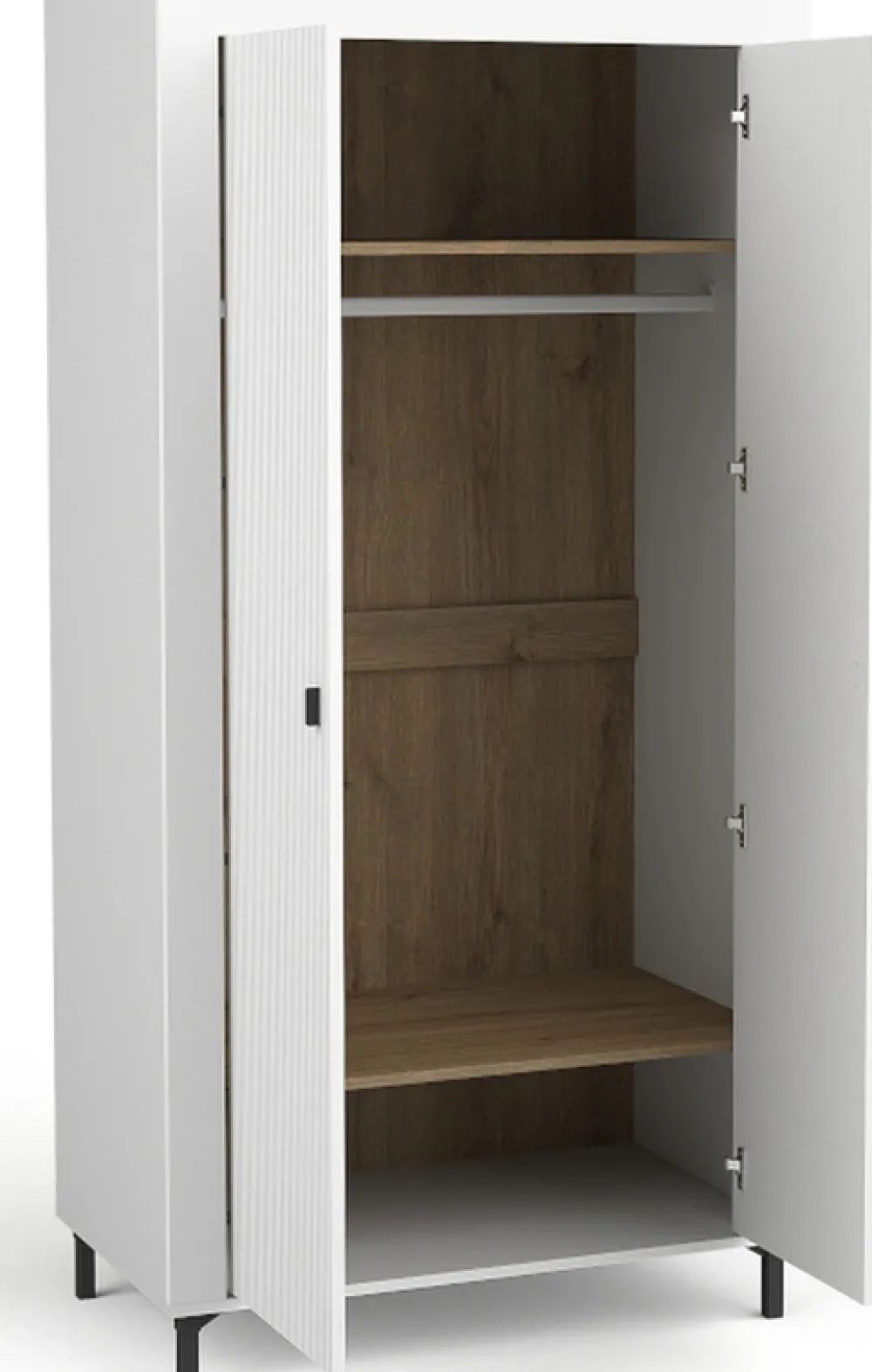 Nowoczesna dwudrzwiowa szafa MISTY to doskonałe rozwiązanie dla osób szukających funkcjonalnego i stylowego mebla do przechowywania odzieży. Za drzwiami znajdują się dwie przestronne półki oraz drążek na wieszaki, które pozwalają na wygodne rozplanowanie ubrań – od swetrów i koszul, po długie płaszcze i sukienki. Taka konfiguracja zapewnia łatwy dostęp do odzieży oraz utrzymanie porządku w szafie.