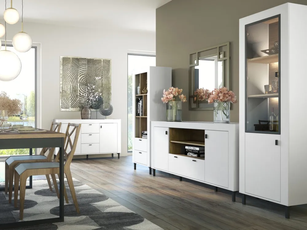 Szafa została wykonana z trwałej płyty meblowej, a wszystkie obrzeża zostały zabezpieczone okleiną ABS, co zwiększa jej odporność na codzienne użytkowanie oraz chroni przed uszkodzeniami mechanicznymi. Dzięki temu mebel przez długie lata zachowuje swój nowoczesny wygląd.