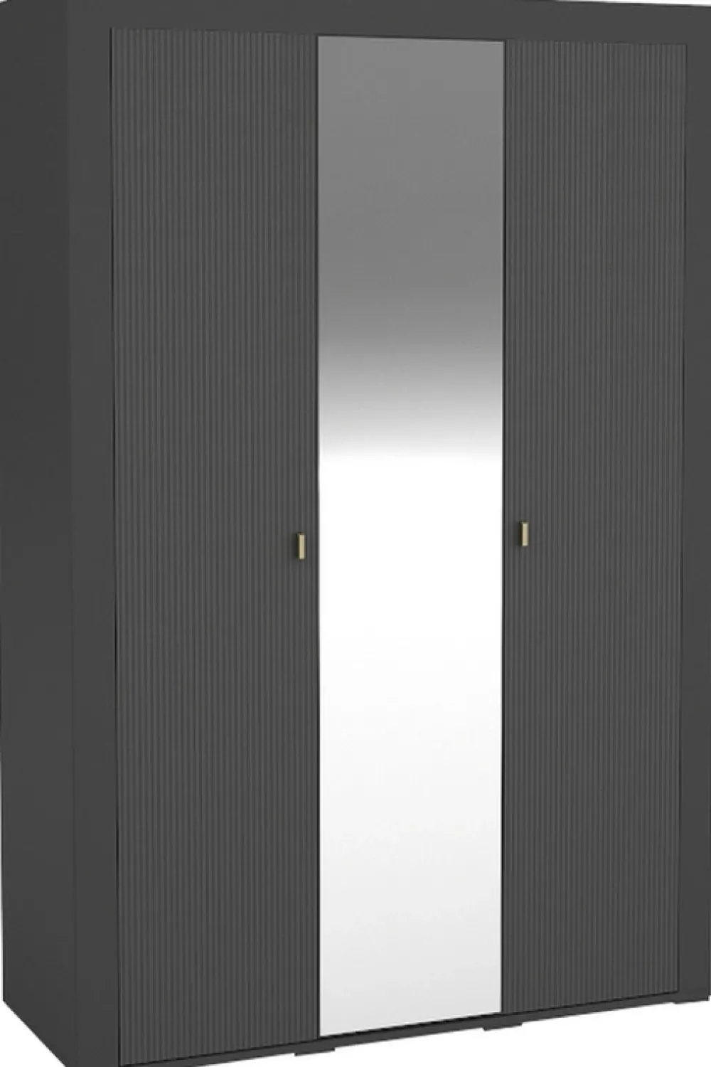 - Szafa uchylna 137 cm MISTY posiada parę drzwi po lewej stronie, za którymi znajdują się dwie półki oraz drążek na wieszaki. Po prawej stronie szafy swoje miejsce znalazło pięć półek. Szafa charakteryzuje się prążkowanymi frontami.