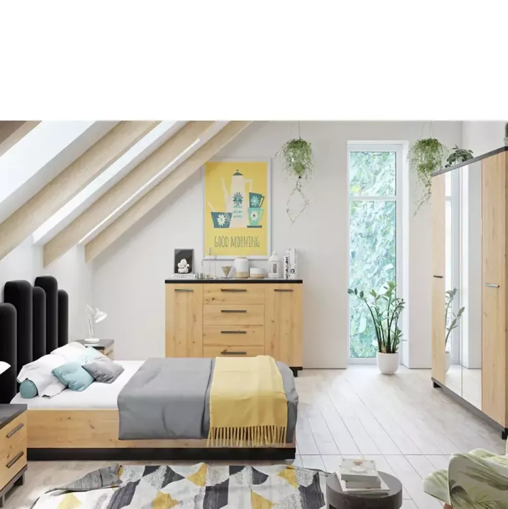 Nowoczesna komoda do salonu 135 cm wyposażona została w cztery pojemne szuflady pracujące na prowadnicach rolkowych oraz dwie zamykane szafki po zewnętrznych stronach, w których ukryto po jednej półce.