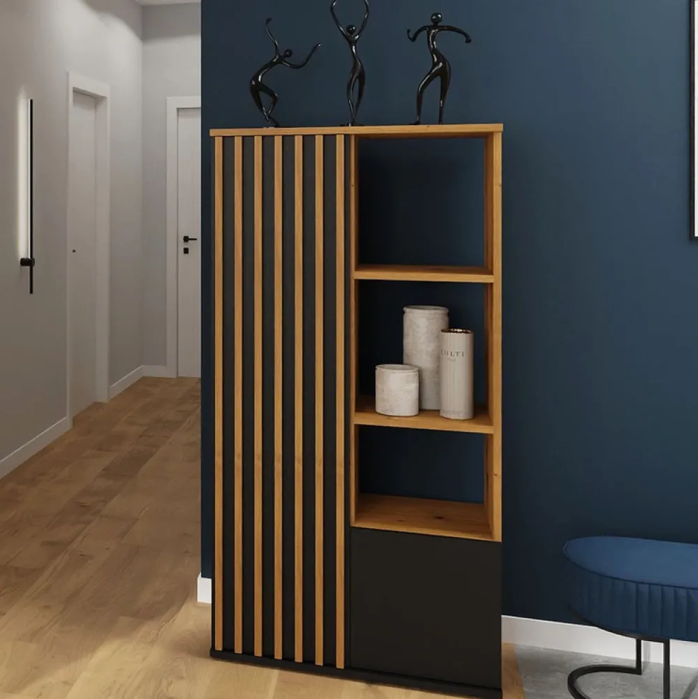To, co wyróżnia nasz regał, to zastosowanie wstawek lamelowych. Dodają one meblowi unikalnego charakteru i tekstury. Lamele tworzą niepowtarzalny, rytmiczny wzór, który dodaje głębi i złożoności całej konstrukcji. Wizualnie lekkie, ale solidne, stanowią wyrafinowany detal, który nada Twojemu wnętrzu niepowtarzalnego uroku.