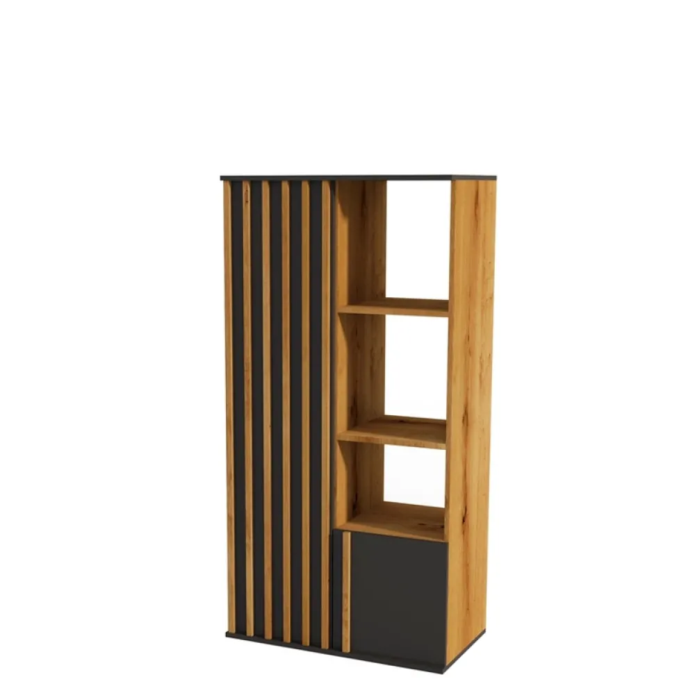 - Regał na książki NELGARI został wykonany w ponadczasowej stylistyce, dzięki której znajduje uznanie zarówno we współczesnych, jak i loftowych aranżacjach pomieszczeń. Posiada dwie otwarte półki oraz dwie półki za drzwiami z lamelami i szafkę u dołu.