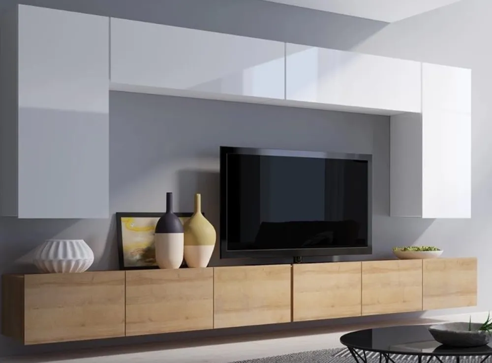 - Dwudrzwiowa szafka pod telewizor o szerokości 100 cm. Szafka jest uniwersalna, ponieważ można ją zawiesić lub postawić na załączonych stopkach. Mebel wykonany w nowoczesnym stylu.