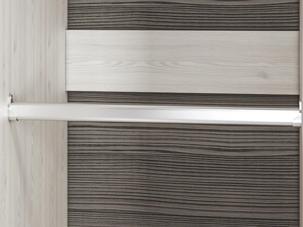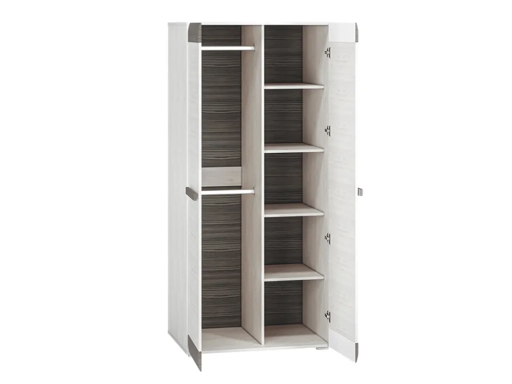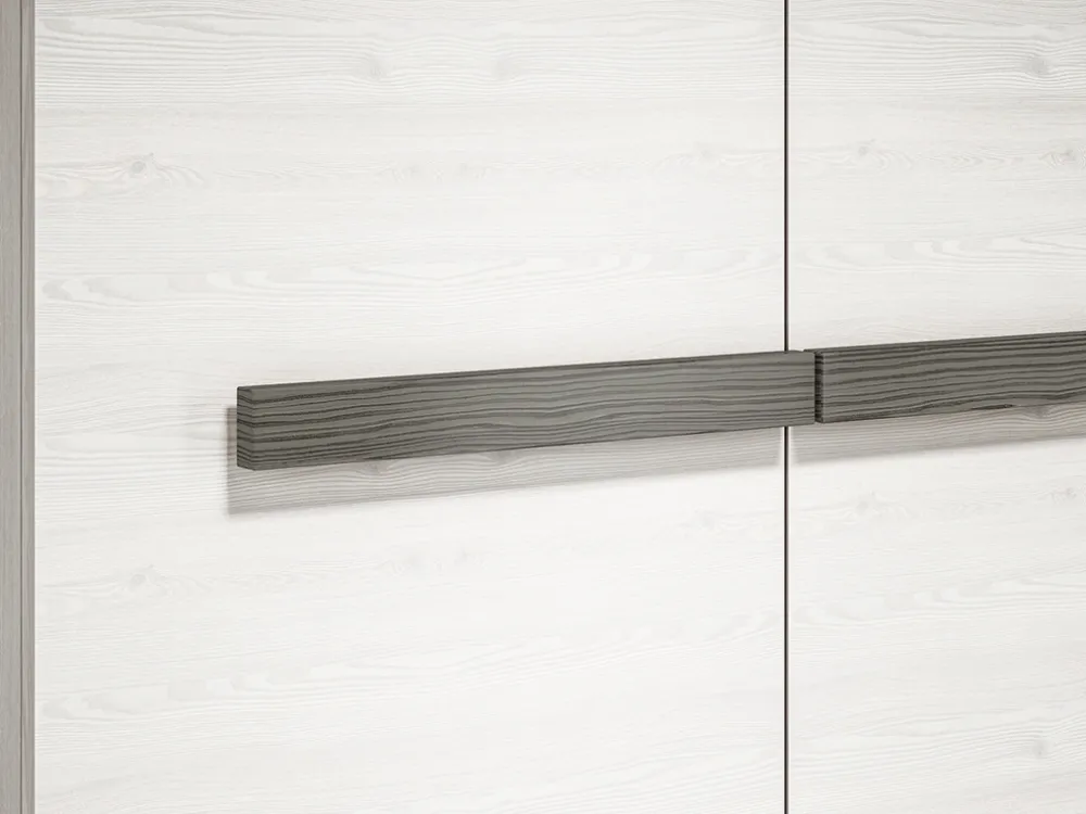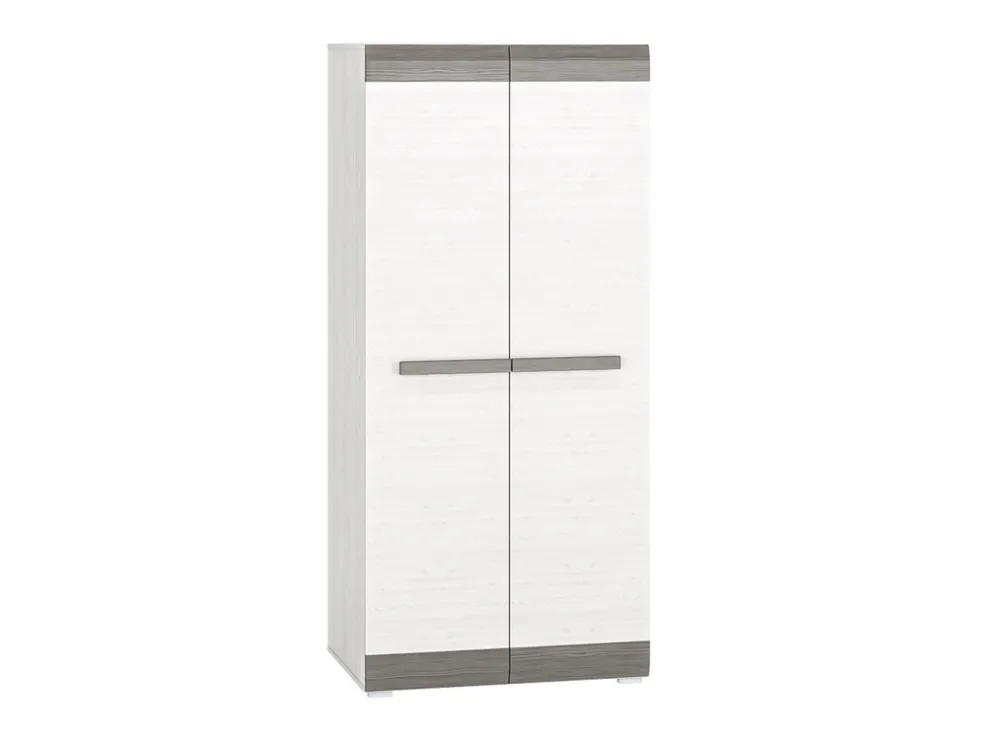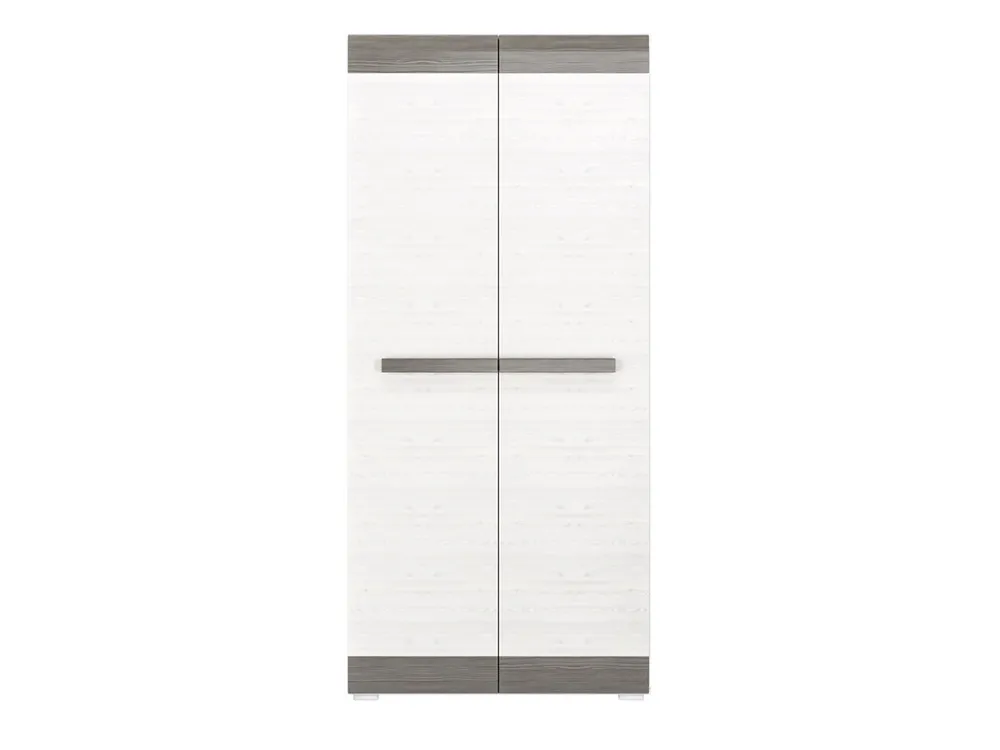 - Szafa BLANCO posiada dwa aluminiowe drążki na wieszaki po lewej stronie oraz pięć półek na ubrania po prawej stronie. Uchwyty szafy zostały wykonane z płyty MDF. Obrzeża wykończono okleiną ABS. Szafa w kolorystyce sosny śnieżnej łączonej z szarym.