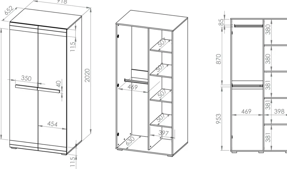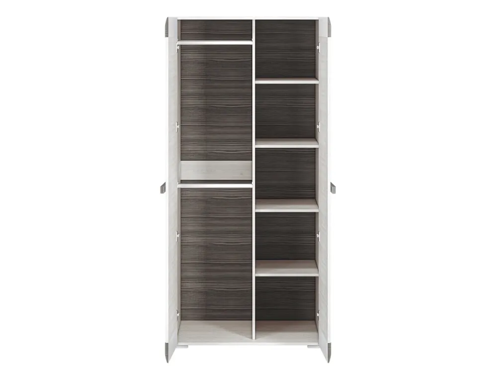 Za lewymi drzwiami tej szafy znajdziesz dwa drążki na wieszaki, które pozwolą Ci na przechowywanie odzieży w sposób uporządkowany i łatwo dostępny. Idealna do wieszania płaszczy, koszul czy sukienek – wszystkie Twoje ulubione ubrania będą miały swoje miejsce. Z kolei po prawej stronie, czeka na Ciebie pięć przestronnych półek, które doskonale sprawdzą się do przechowywania złożonej odzieży, akcesoriów czy pościeli, pomagając utrzymać porządek w Twojej garderobie.