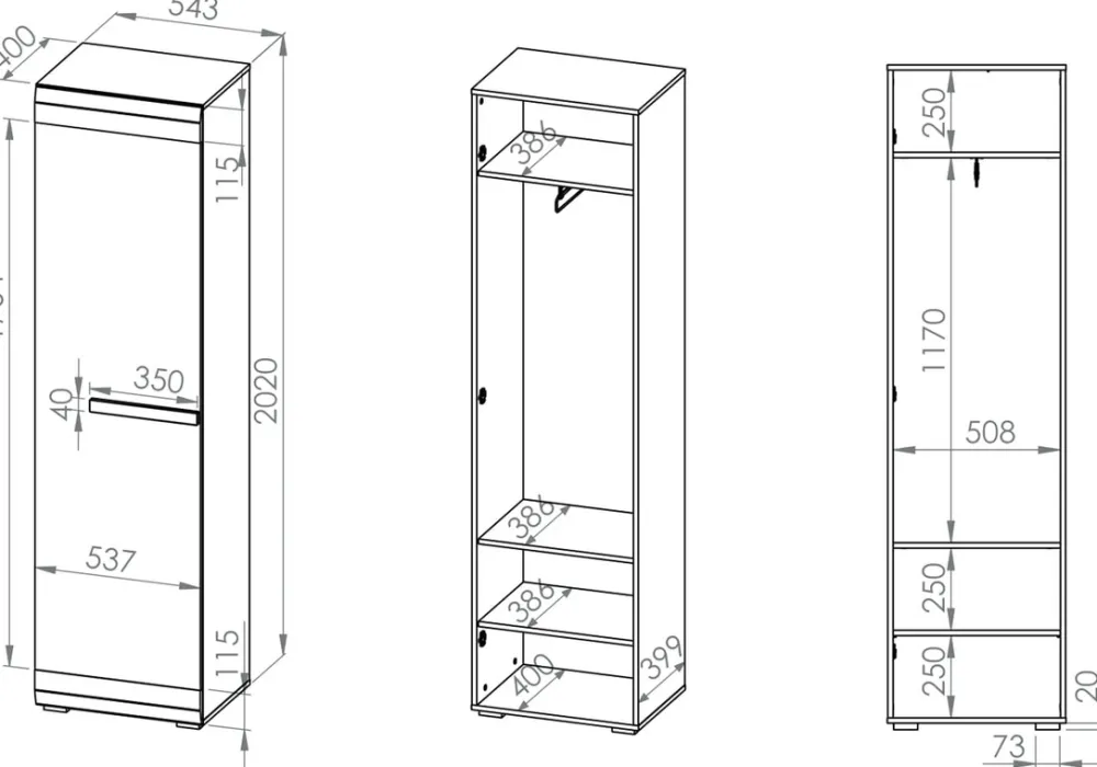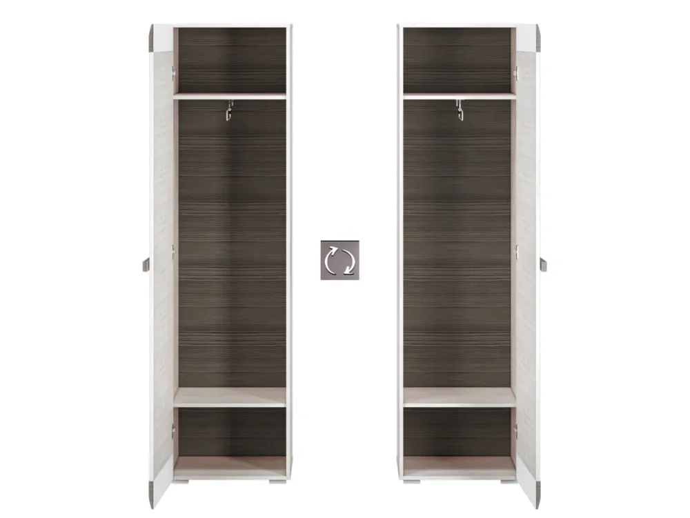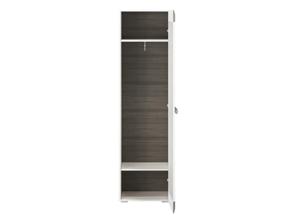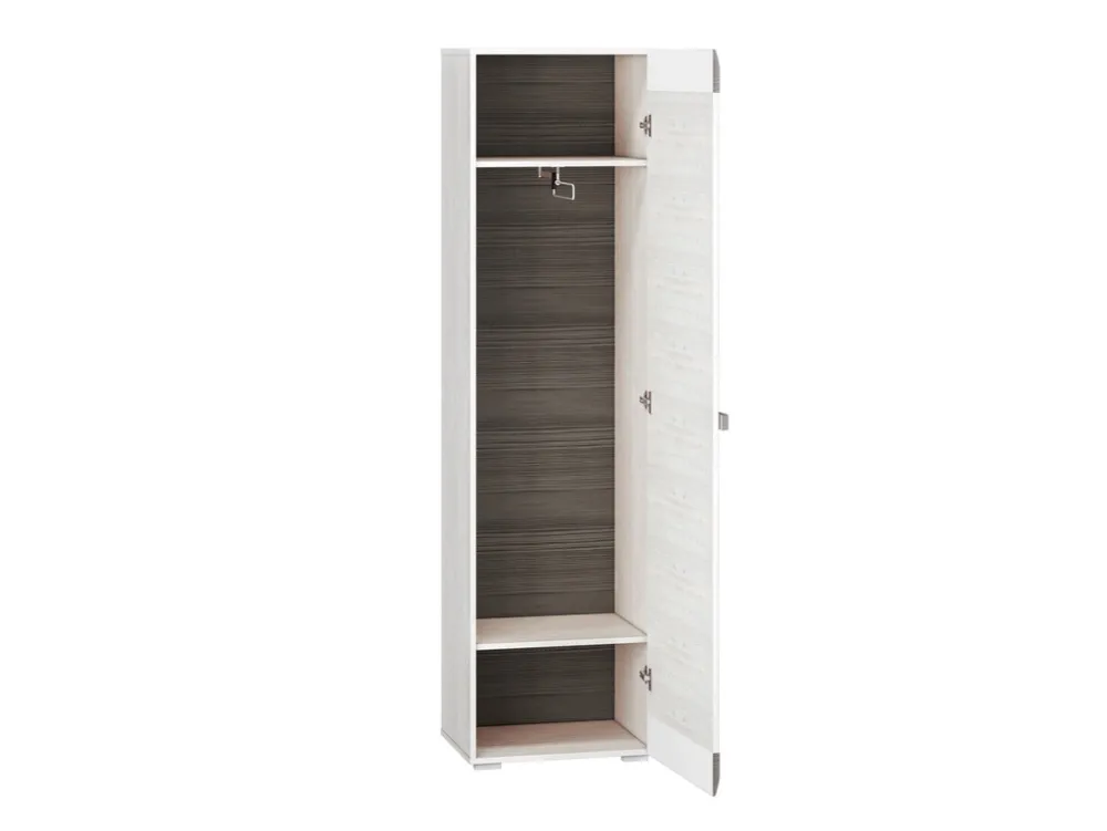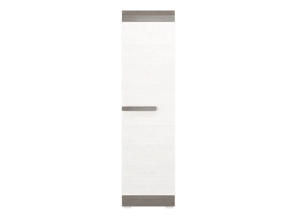 - Szafa jednodrzwiowa 55 cm BLANCO posiada półkę u góry, pod którą znajduje się wysuwany drążek na wieszaki. U dołu szafy znajduje się półka na ubrania. Szafa posiada uchwyt wykonany z listwy MDF. Obrzeża szafy zostały wykończone okleiną ABS.