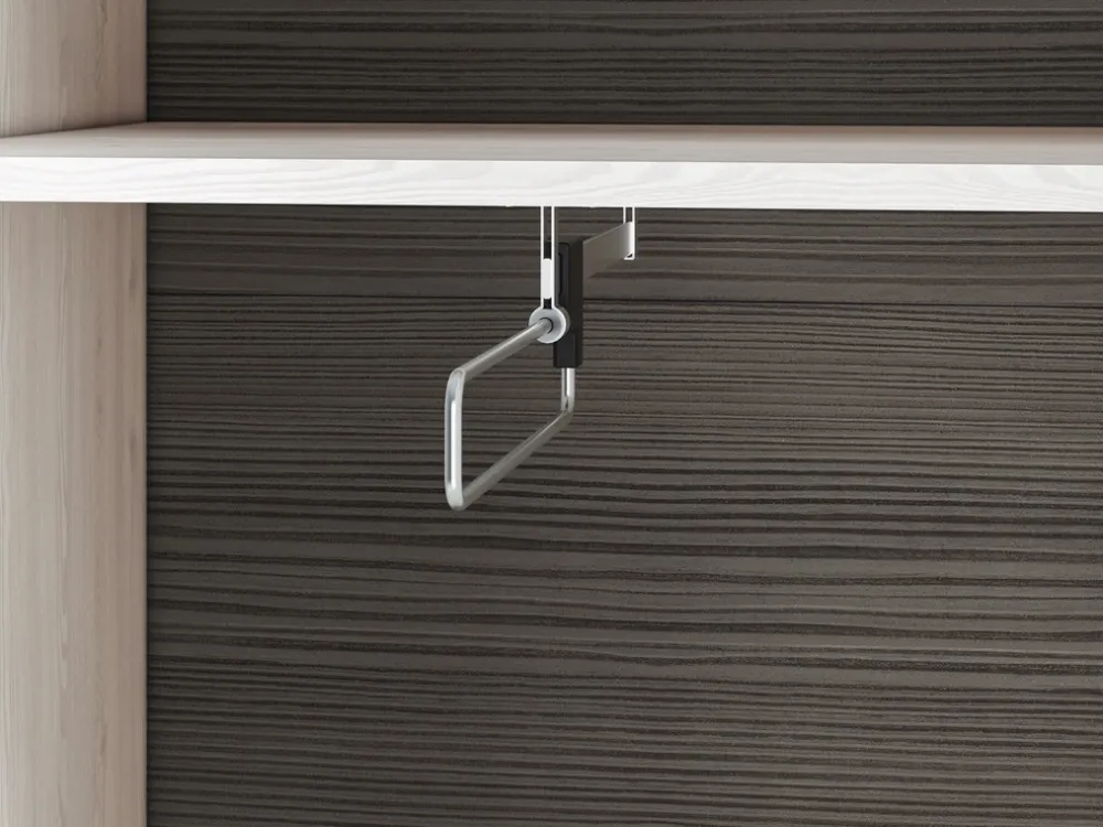 Szafa została zaprojektowana z myślą o praktycznym przechowywaniu różnych elementów garderoby. Za drzwiami znajduje się górna półka, idealna na kapelusze, torebki lub inne akcesoria, które chcesz mieć pod ręką. Poniżej znajduje się wysuwany drążek na ubrania, który umożliwia wygodne przechowywanie płaszczy, koszul czy sukienek, zapewniając łatwy dostęp do Twojej ulubionej odzieży.