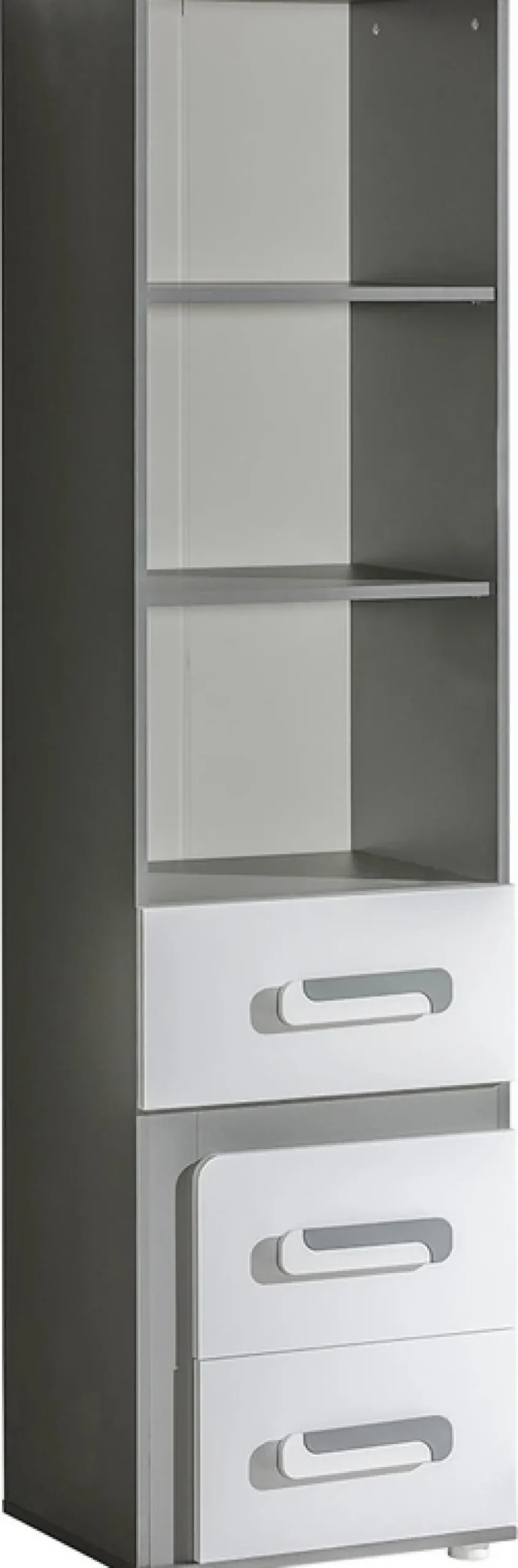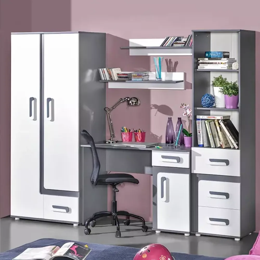 - Młodzieżowa meblościanka z kolekcji mebli systemowych APETITO. Meblościanka składa się z szafy z szufladą i drążkiem na wieszaki, biurka z szufladą i szafką, dwóch półek wiszących o szerokości 90 cm oraz regału z szufladami i półkami.