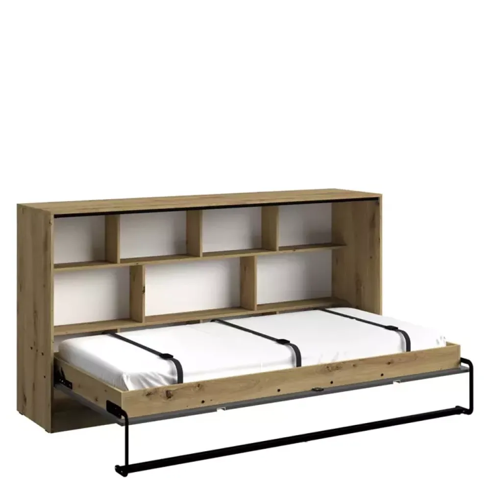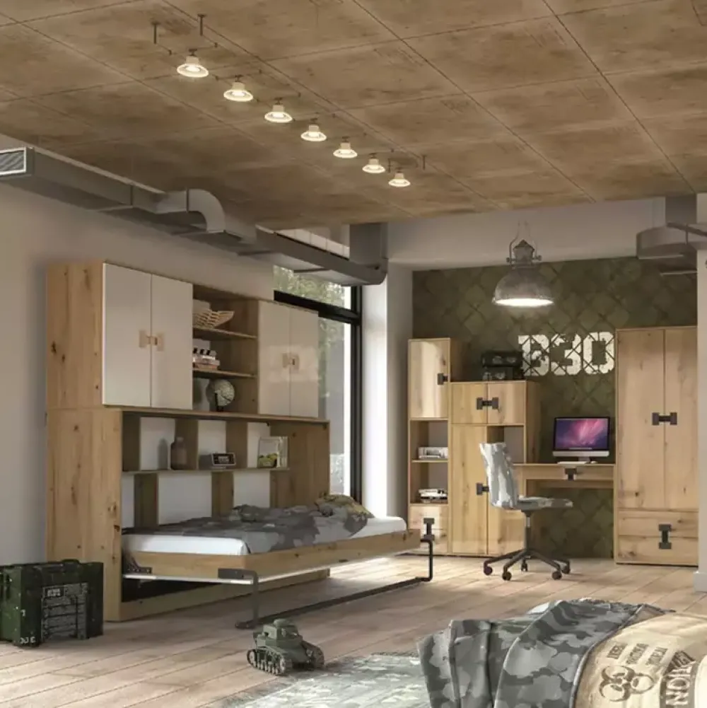- Komplet mebli młodzieżowych z chowanym łóżkiem w kolorze Dąb Artisan z kolekcji INDEX. W zestawie znalazł miejsce półkotapczan poziomy razem z jego nadstawką, regał o szerokości 40 cm, biurko razem z regałem oraz pojemną szafę z szufladami.