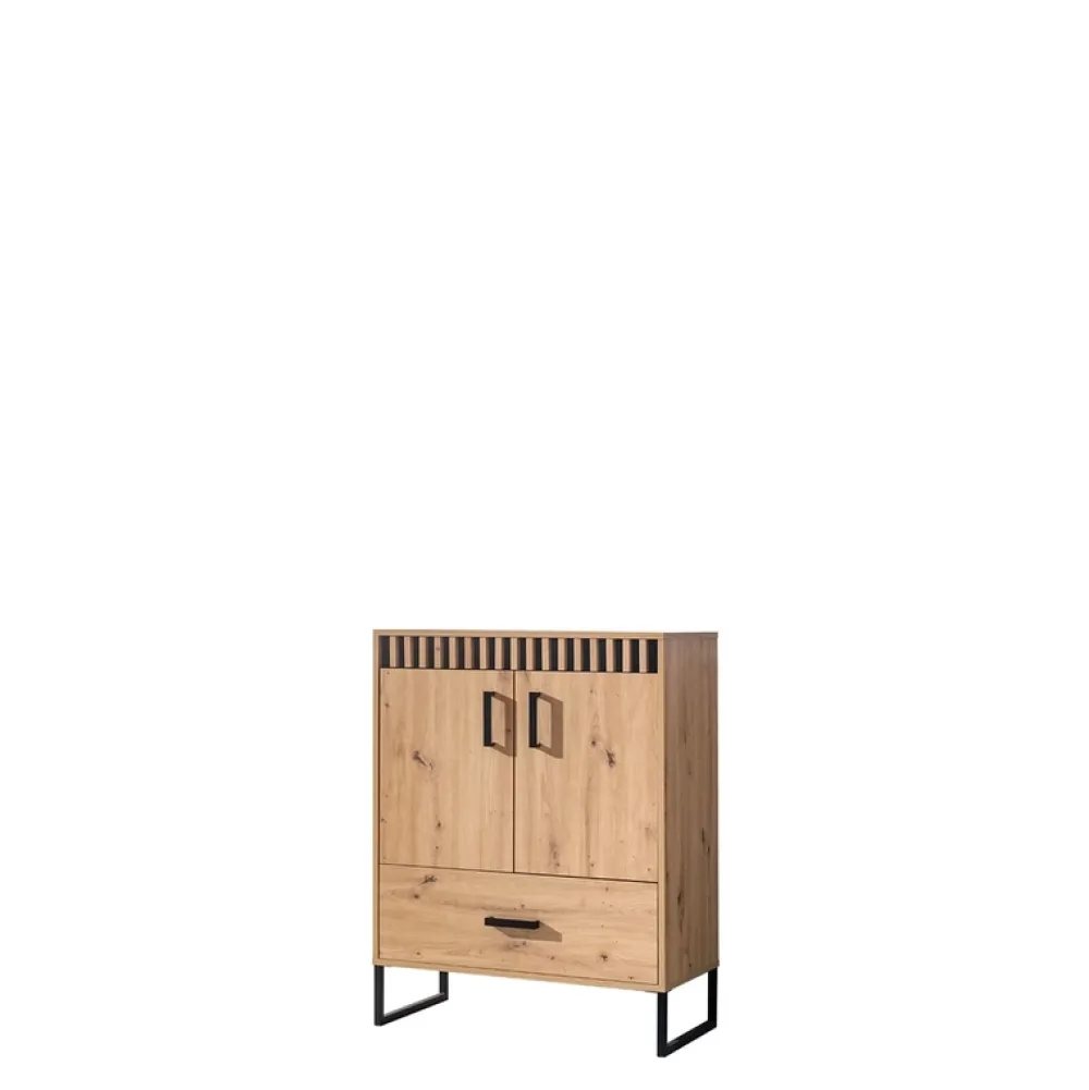 Całość wykonana jest z wytrzymałej płyty laminowanej o grubości 16 mm w ciepłym, naturalnym odcieniu dąb artisan. To kolor, który wprowadza do wnętrza przytulność, a zarazem podkreśla surowy, industrialny styl loftowy. Czarne detale, takie jak metalowe nogi i uchwyty, stanowią doskonałe dopełnienie designu, tworząc silny, ale harmonijny kontrast.