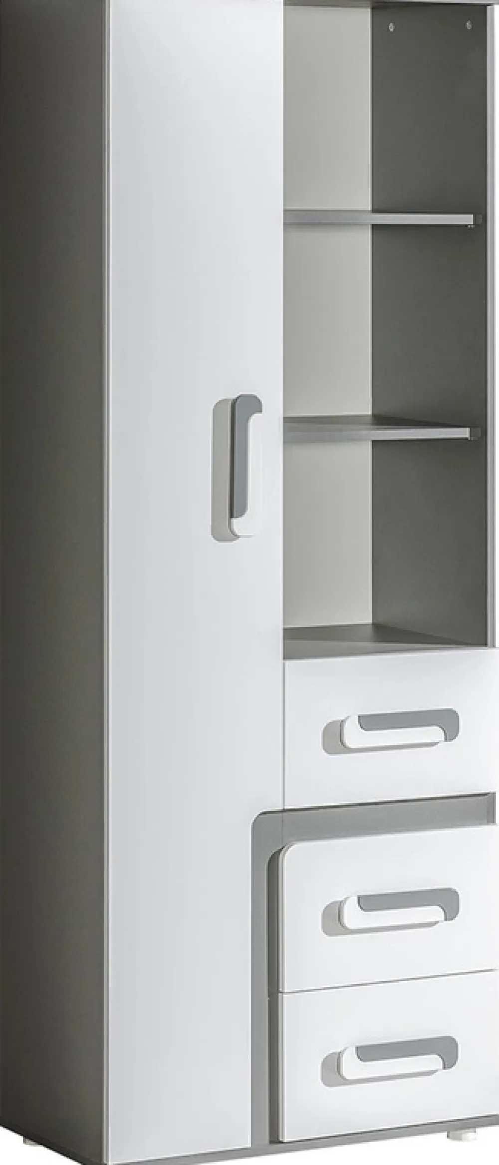 Nowoczesny regał z młodzieżowej kolekcji mebli systemowych APETITO posiada trzy szuflady oraz dwie otwarte półki. Za drzwiami chowają się cztery półki, dzięki czemu regał stanowi idealne rozwiązanie dla osób, które uwielbiają porządek na półkach.