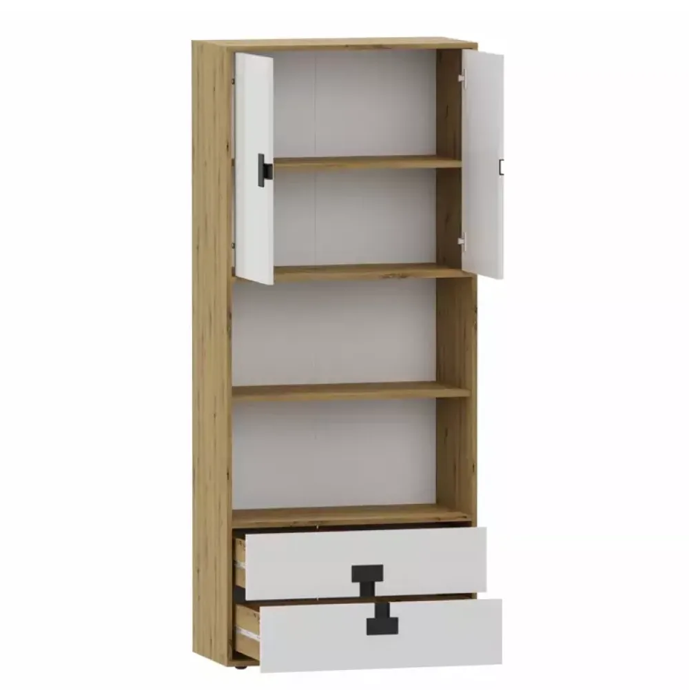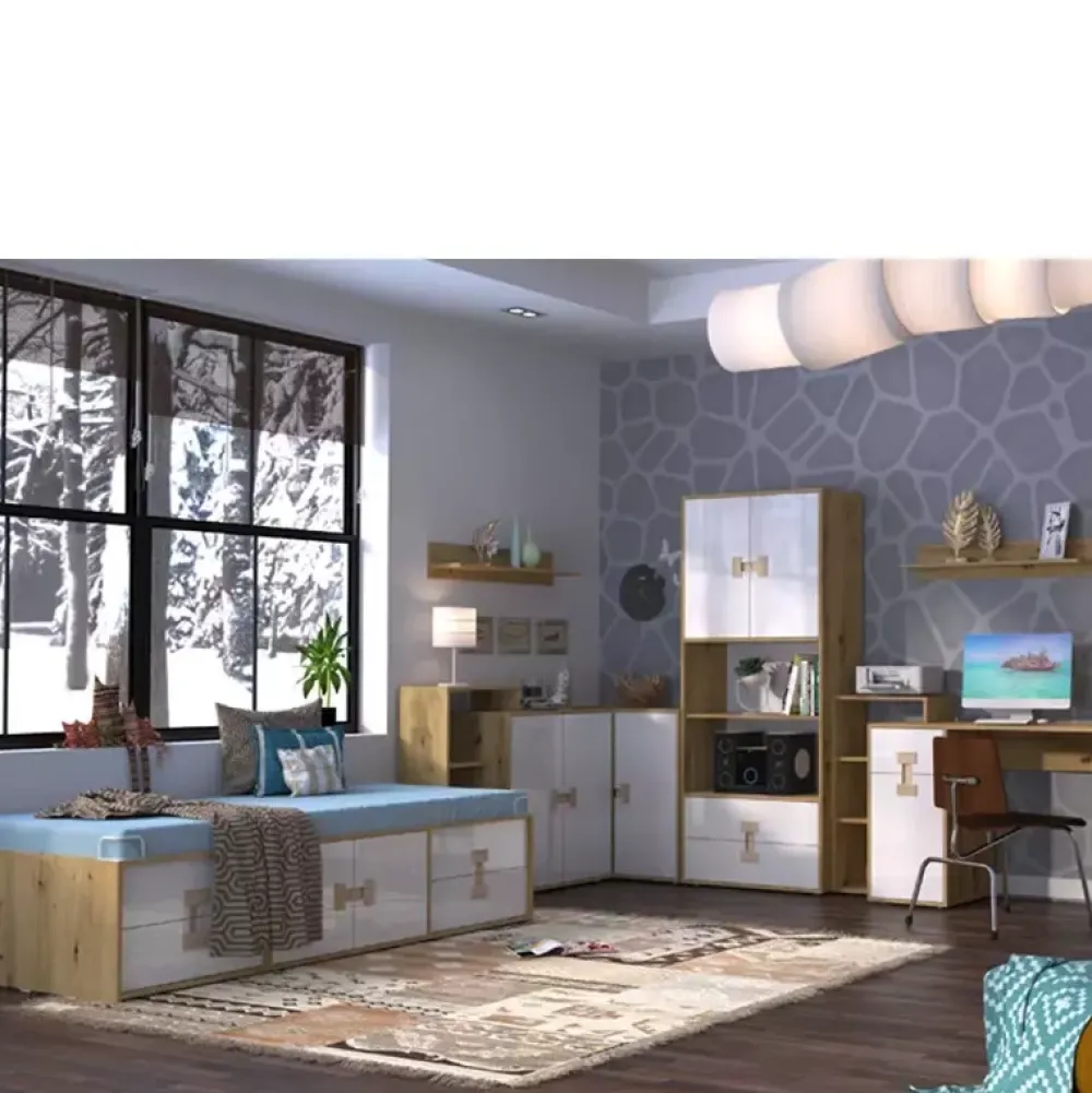 - Zestaw mebli do pokoju młodzieżowego w kolorze Dąb Artisan z kolekcji INDEX. Zestaw mebli zawiera wysokie łóżko z miejscem na akcesoria sypialniane, komodę narożną razem z nadstawką, regał 80 cm, biurko z nadstawką oraz dwie półki 90 cm.