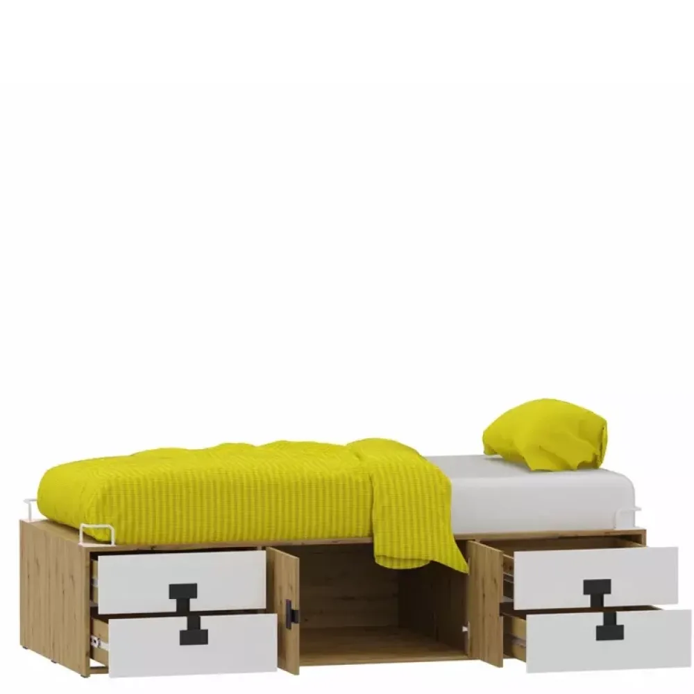 Meble młodzieżowe INDEX to świetny przykład nowoczesnego wykończenia pomieszczenia, które wpasuje się nawet w najbardziej wymagające gusta. Proste, a zarazem funkcjonalne rozwiązania do pokoju młodzieżowego przypadają do gustu zarówno młodzieży, jak i rodzicom. Nowoczesne łóżko posiada cztery szuflady oraz drzwi, za którymi znajdziemy miejsce na akcesoria sypialniane. Komoda narożna, która znalazła miejsce w zestawie, zadba o miejsce na nasze ubrania oraz dostęp do nich, posiadając w środku po trzy poziomy na każdą z dwóch stron, została wyposażona w nadstawkę, która będzie zdobiła nasze pomieszczenie dekorami, jakie możemy położyć na jej półkach. Duży regał został wyposażony we dwie szuflady oraz cztery półki, gdzie dwie zostały zamknięte parą drzwi. Biurko stanowiące idealne miejsce do umiejscowienia komputera zostało również wyposażone w nadstawkę. Uzupełnieniem zestawu są dwie półki, na których możemy umiejscowić rozmaite książki, dekory czy kwiatki, aby ożywić nasze pomieszczenie.