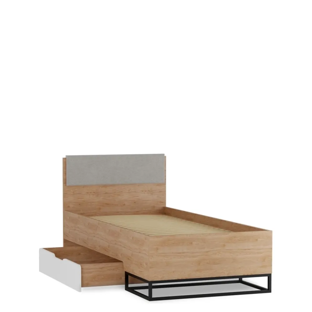 Łóżko o powierzchni spania 90×200 cm posiada praktyczny pojemnik, w którym ukryjesz pościel, dodatkowe poduszki czy sezonowe ubrania, utrzymując porządek w pokoju.