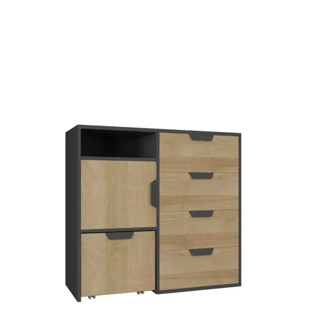- Komoda jest dostępna w dwóch wariantach kolorystycznych: Grafit + Enigma oraz Grafit + Dąb Rivera.